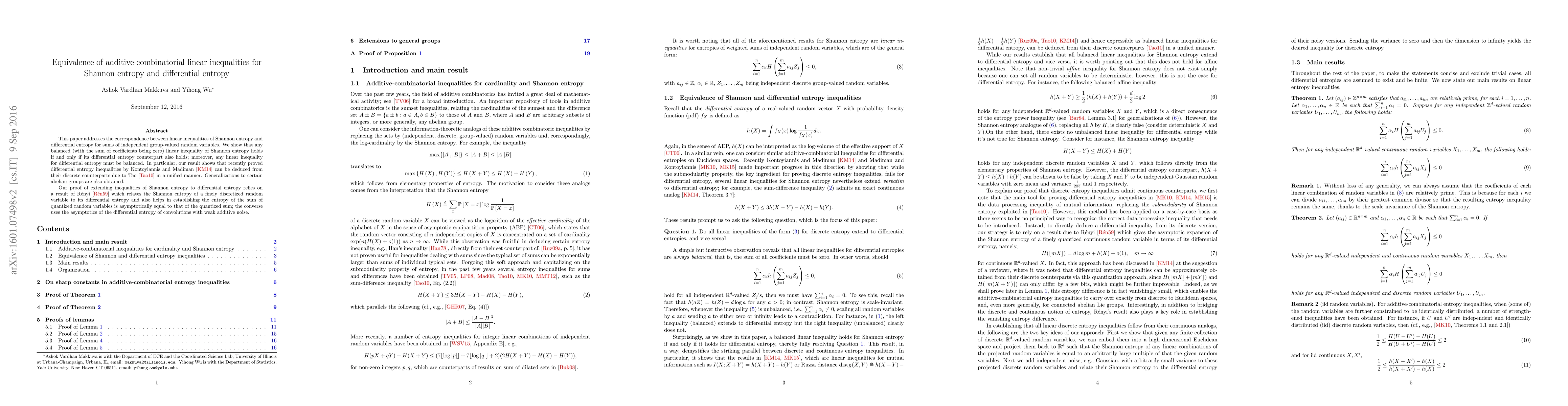 This paper establishes equivalence between linear inequalities of Shannon entropy and differential entropy for sums of independent group-valued random variables, showing that balanced inequalities hold for both. It extends recent differential entropy inequalities to their discrete counterparts using Rényi's entropy relation.