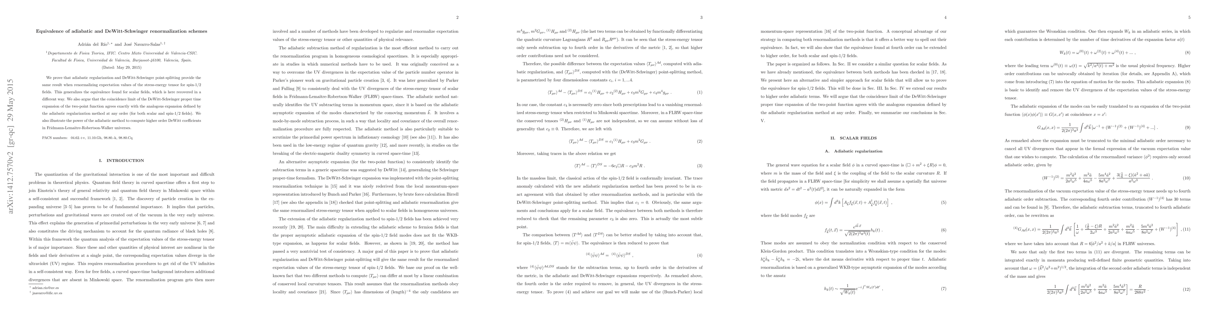 This paper demonstrates that adiabatic regularization and DeWitt-Schwinger point-splitting yield identical results for renormalized stress-energy tensors in spin-$1/2$ fields, extending the known equivalence for scalar fields. It also shows agreement between the DeWitt-Schwinger proper time expansion and adiabatic regularization for two-point functions at all orders.