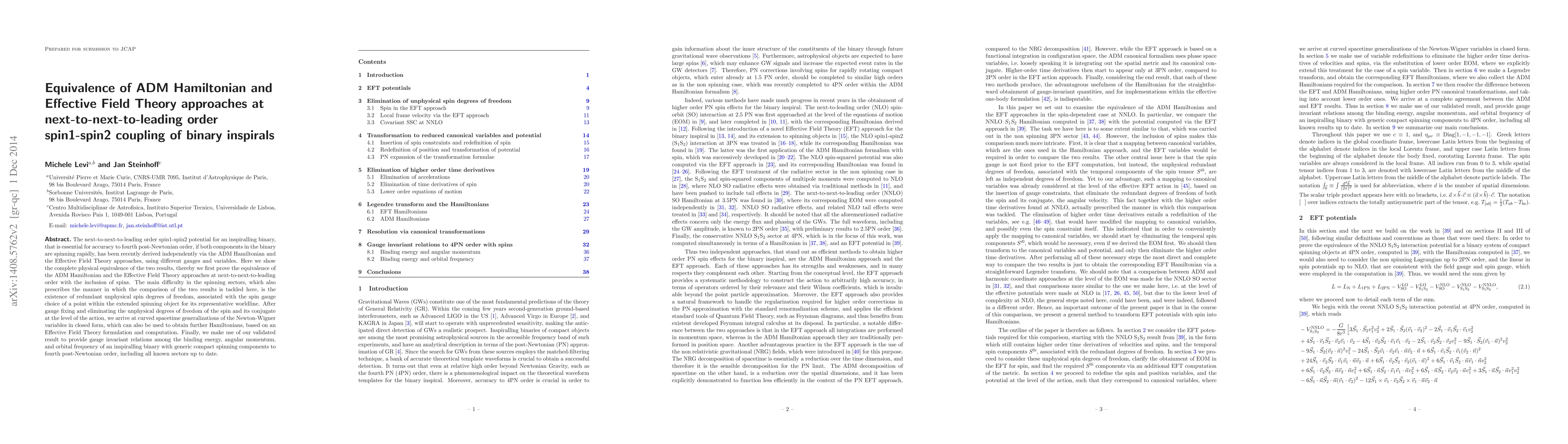 The next-to-next-to-leading order spin1-spin2 potential for an inspiralling binary, that is essential for accuracy to fourth post-Newtonian order, if both components in the binary are spinning rapidly, has been recently derived independently via the ADM Hamiltonian and the Effective Field Theory approaches, using different gauges and variables. Here we show the complete physical equivalence of the two results, thereby we first prove the equivalence of the ADM Hamiltonian and the Effective Field Theory approaches at next-to-next-to-leading order with the inclusion of spins. The main difficulty in the spinning sectors, which also prescribes the manner in which the comparison of the two results is tackled here, is the existence of redundant unphysical spin degrees of freedom, associated with the spin gauge choice of a point within the extended spinning object for its representative worldline. After gauge fixing and eliminating the unphysical degrees of freedom of the spin and its conjugate at the level of the action, we arrive at curved spacetime generalizations of the Newton-Wigner variables in closed form, which can also be used to obtain further Hamiltonians, based on an Effective Field Theory formulation and computation. Finally, we make use of our validated result to provide gauge invariant relations among the binding energy, angular momentum, and orbital frequency of an inspiralling binary with generic compact spinning components to fourth post-Newtonian order, including all known sectors up to date.