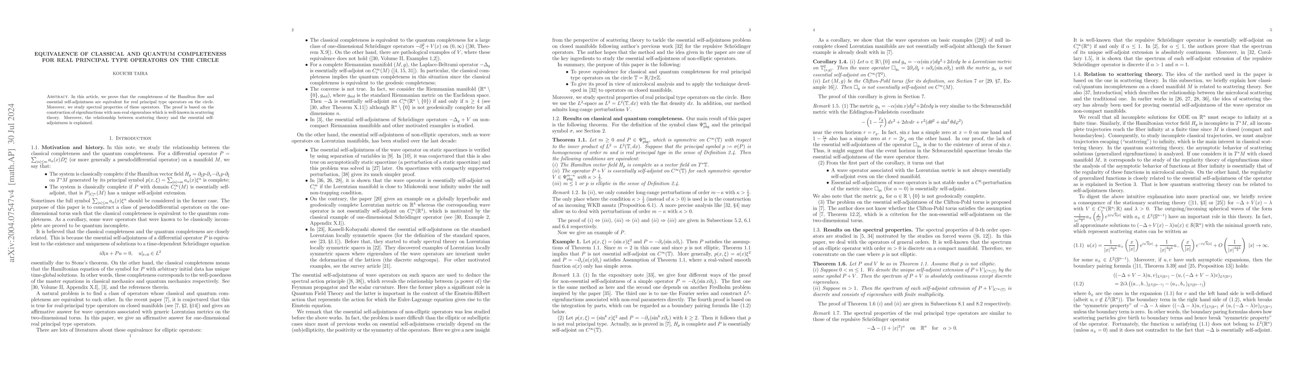 Researchers prove that classical completeness is equivalent to quantum completeness for real principal type operators on the circle, with implications for understanding spectral properties of these operators.