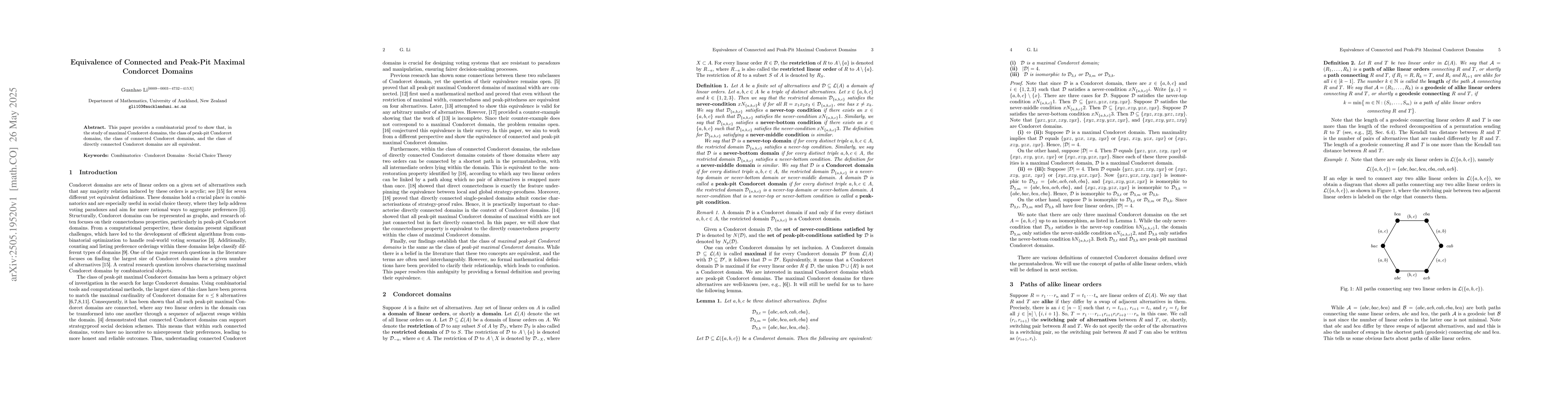 The paper presents a novel combinatorial proof demonstrating the equivalence of peak-pit, connected, and directly connected maximal Condorcet domains.