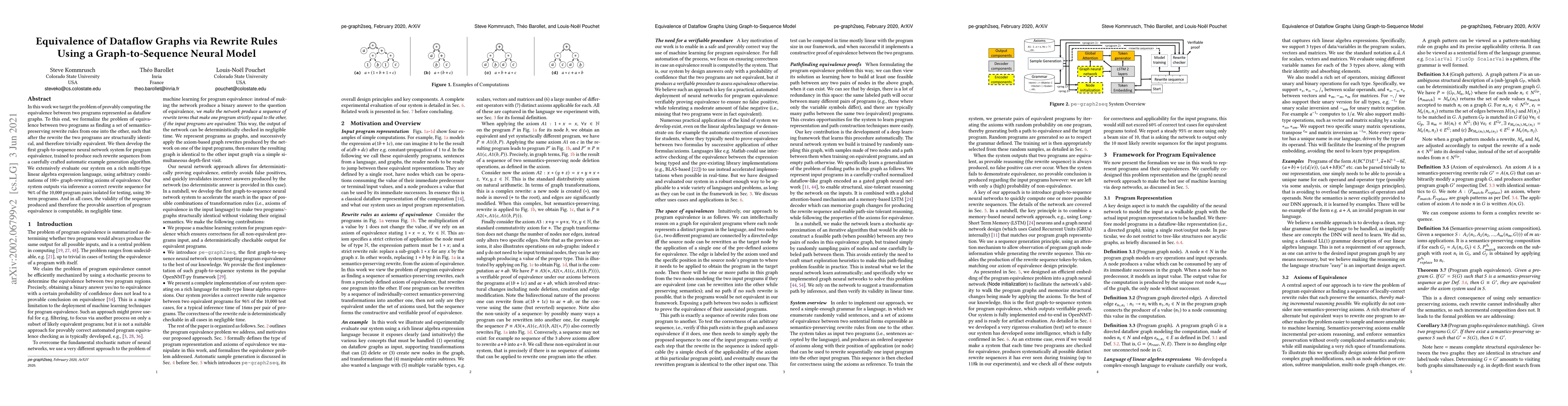 This paper proposes a graph-to-sequence neural network system to determine program equivalence by generating semantics-preserving rewrite rules that transform one dataflow graph into another. The system achieves 96% accuracy on a test set of 10,000 program pairs, ensuring the validity of the generated rewrite sequences.