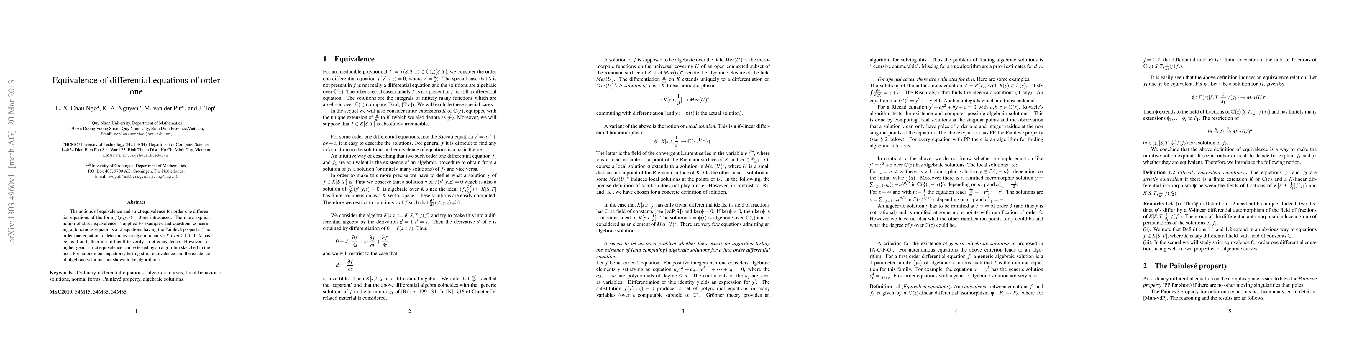 The notions of equivalence and strict equivalence for order one differential equations are introduced. The more explicit notion of strict equivalence is applied to examples and questions concerning autonomous equations and equations having the Painleve property. The order one equation determines an algebraic curve. If this curve has genus zero or one, then it is difficult to verify strict equivalence. However, for higher genus strict equivalence can be tested by an algorithm sketched in the text. For autonomous equations, testing strict equivalence and the existence of algebraic solutions are shown to be algorithmic.