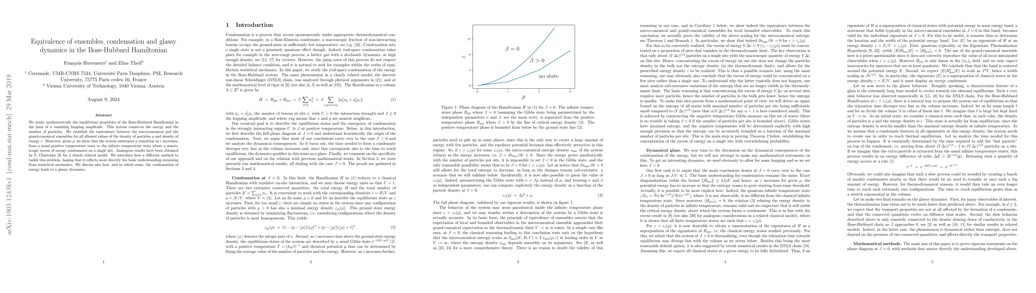 We study mathematically the equilibrium properties of the Bose-Hubbard Hamiltonian in the limit of a vanishing hopping amplitude. This system conserves the energy and the number of particles. We establish the equivalence between the microcanonical and the grand-canonical ensembles for all allowed values of the density of particles $\rho$ and density of energy $\varepsilon$. Moreover, given $\rho$, we show that the system undergoes a transition as $\varepsilon$ increases, from a usual positive temperature state to the infinite temperature state where a macroscopic excess of energy condensates on a single site. Analogous results have been obtained by S. Chatterjee (2017) for a closely related model. We introduce here a different method to tackle this problem, hoping that it reflects more directly the basic understanding stemming from statistical mechanics. We discuss also how, and in which sense, the condensation of energy leads to a glassy dynamics.