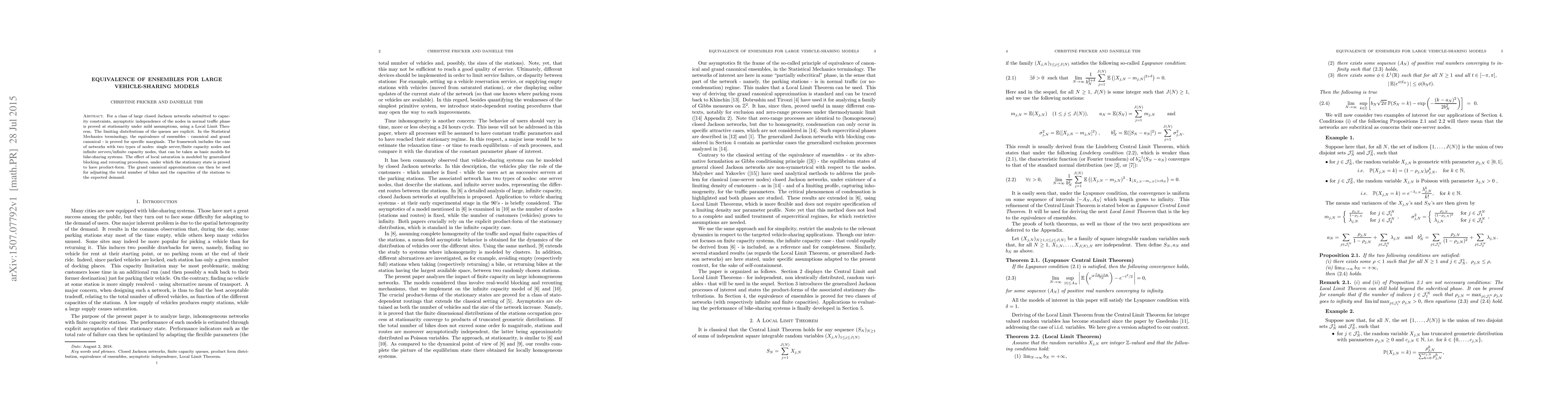 For a class of large closed Jackson networks submitted to capacity constraints, asymptotic independence of the nodes in normal traffic phase is proved at stationarity under mild assumptions, using a Local Limit Theorem. The limiting distributions of the queues are explicit. In the Statistical Mechanics terminology, the equivalence of ensembles - canonical and grand canonical - is proved for specific marginals. The framework includes the case of networks with two types of nodes: single server/finite capacity nodes and infinite servers/infinite capacity nodes, that can be taken as basic models for bike-sharing systems. The effect of local saturation is modeled by generalized blocking and rerouting procedures, under which the stationary state is proved to have product-form. The grand canonical approximation can then be used for adjusting the total number of bikes and the capacities of the stations to the expected demand.
