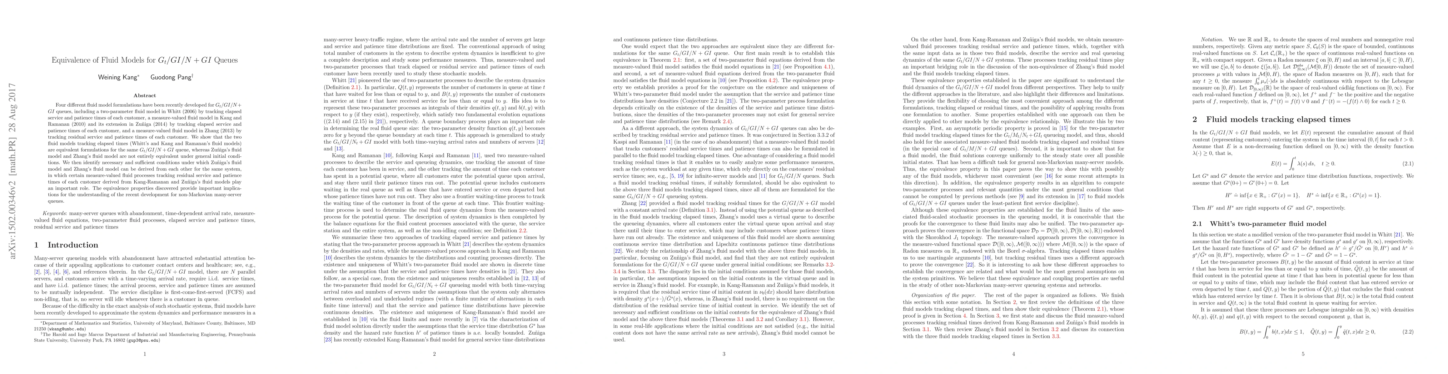 This paper demonstrates the equivalence of two fluid models for $G_t/GI/N+GI$ queues, specifically Whitt's and Kang and Ramanan's models, while showing that Zuñiga's and Zhang's models are not entirely equivalent. It identifies conditions under which Zuñiga's and Zhang's models can be derived from each other, providing insights into the understanding of non-Markovian many-server queues.