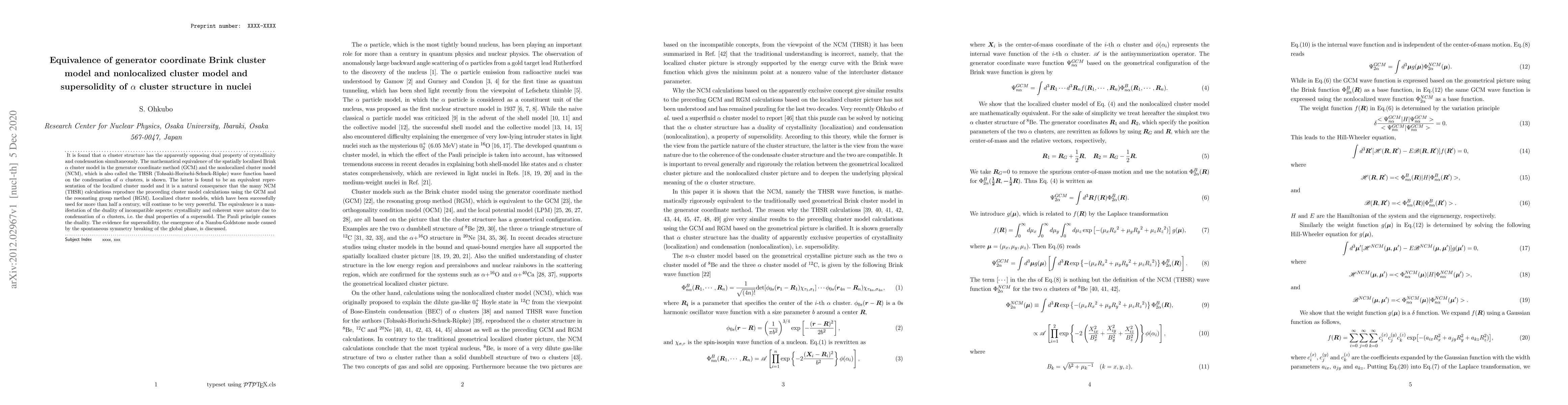 This paper demonstrates the mathematical equivalence between the localized Brink cluster model and the nonlocalized cluster model (THSR) for $\alpha$ cluster structures in nuclei. It reveals the dual properties of $\alpha$ clusters, exhibiting both crystallinity and condensation, akin to supersolidity, and discusses the implications of this duality.