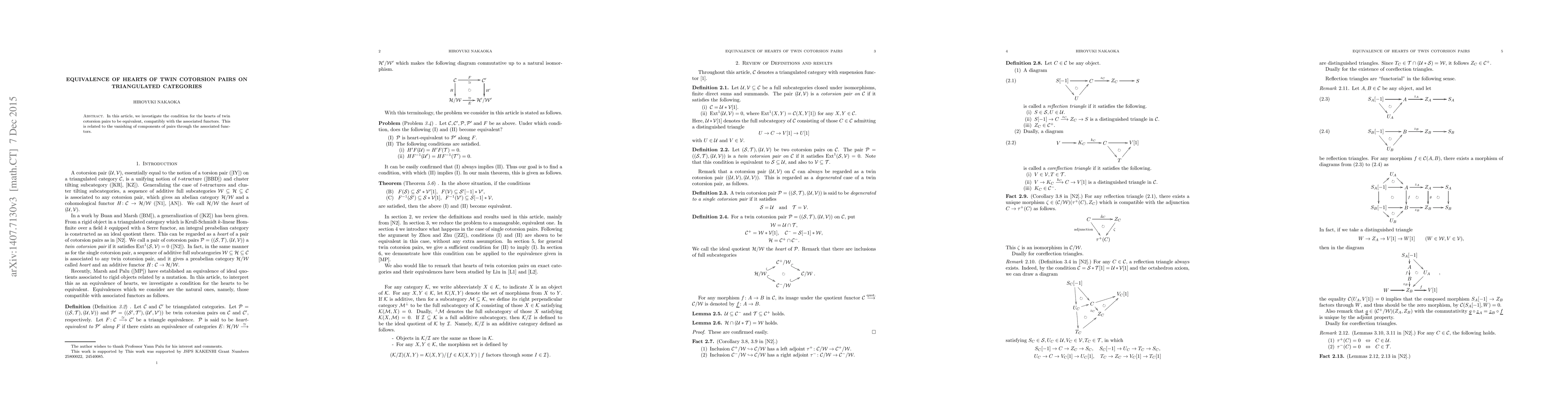 Summary: The paper examines conditions under which the hearts of twin cotorsion pairs in triangulated categories are equivalent, focusing on the role of associated functors and the vanishing of components. It explores the structural equivalence of these hearts.
