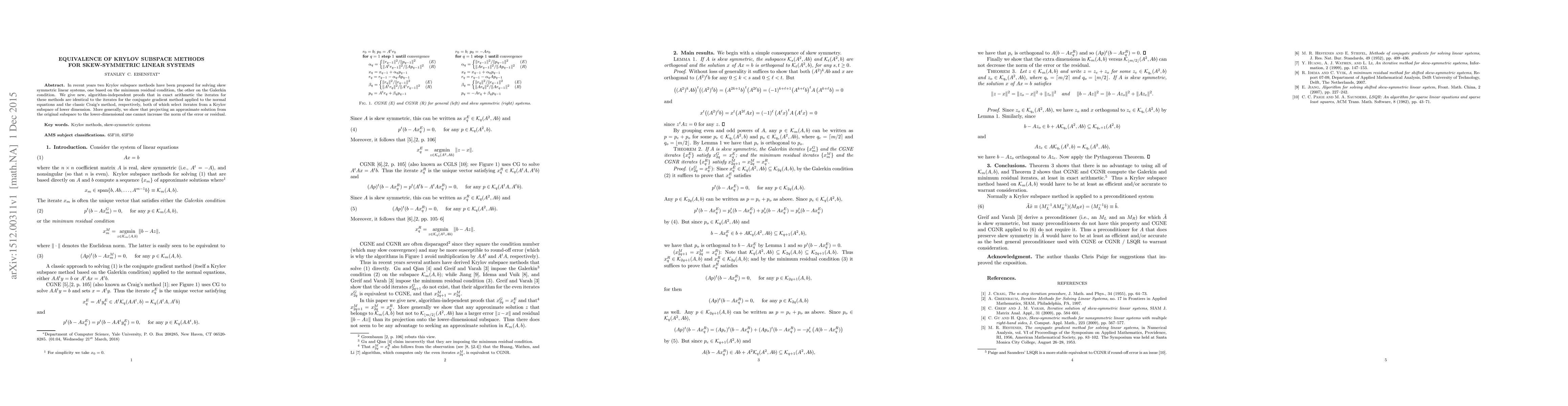 The research provides algorithm-independent proofs for equivalence of Krylov subspace methods for skew-symmetric linear systems, comparing minimum residual and Galerkin conditions with CG applied to normal equations and Craig's method.