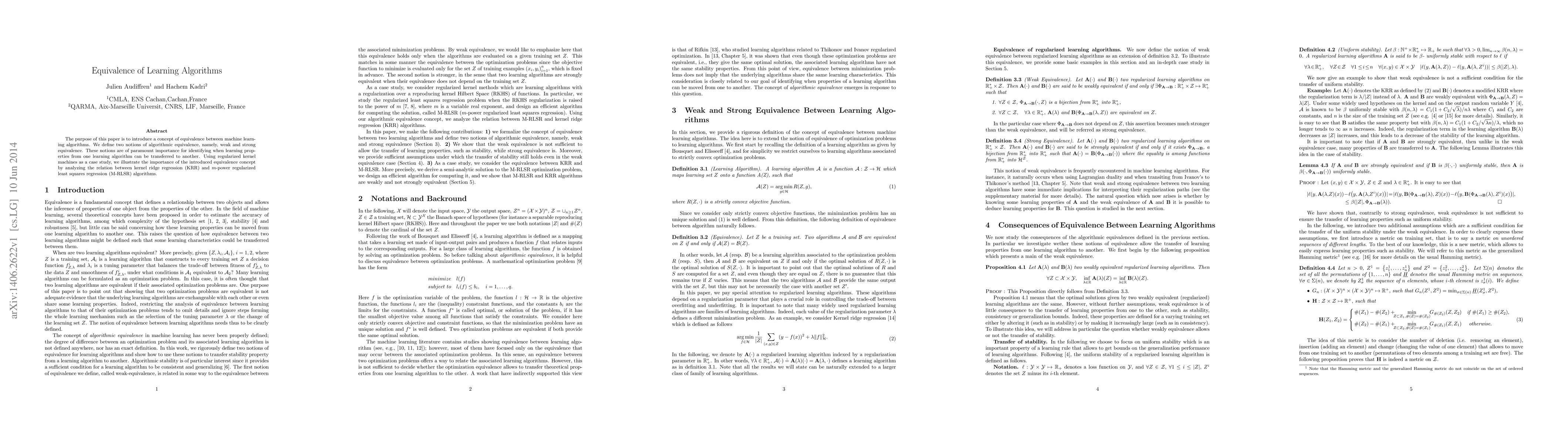 This paper introduces two notions of algorithmic equivalence—weak and strong—to determine when learning properties from one machine learning algorithm can be transferred to another. It uses regularized kernel machines to illustrate these concepts by analyzing the relationship between kernel ridge regression and m-power regularized least squares regression.