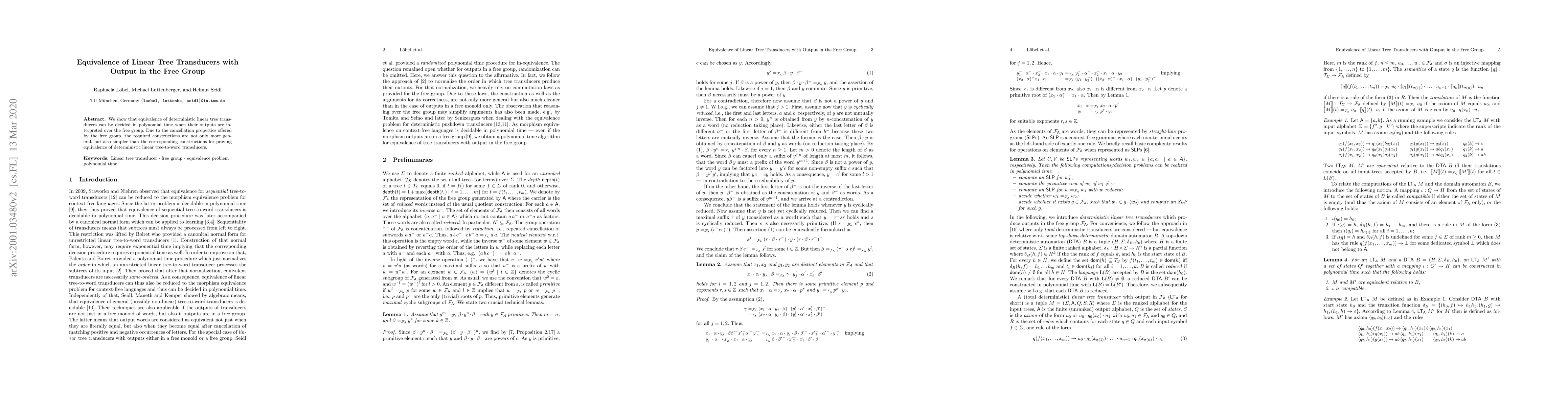 This paper demonstrates that determining equivalence of deterministic linear tree transducers with output in the free group can be achieved in polynomial time. The free group's cancellation properties simplify and generalize the constructions compared to those for linear tree-to-word transducers.