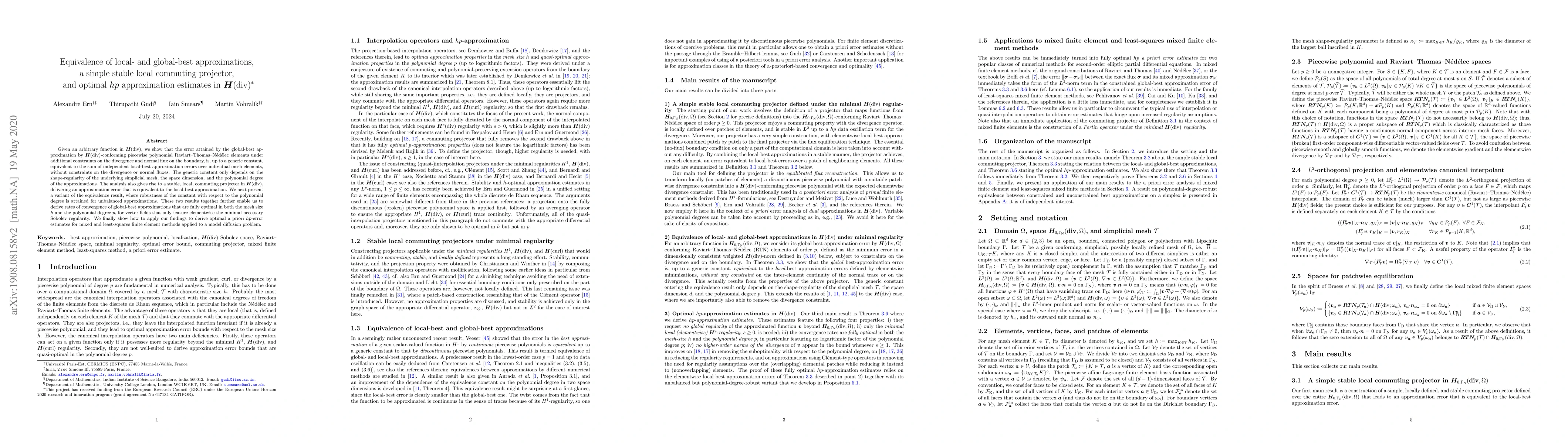 This paper demonstrates the equivalence between local and global best approximations in H(div) spaces, establishing a stable local commuting projector. It also provides optimal hp-approximation estimates for mixed finite element methods, showing robustness and convergence rates for minimal Sobolev regularity vector fields.