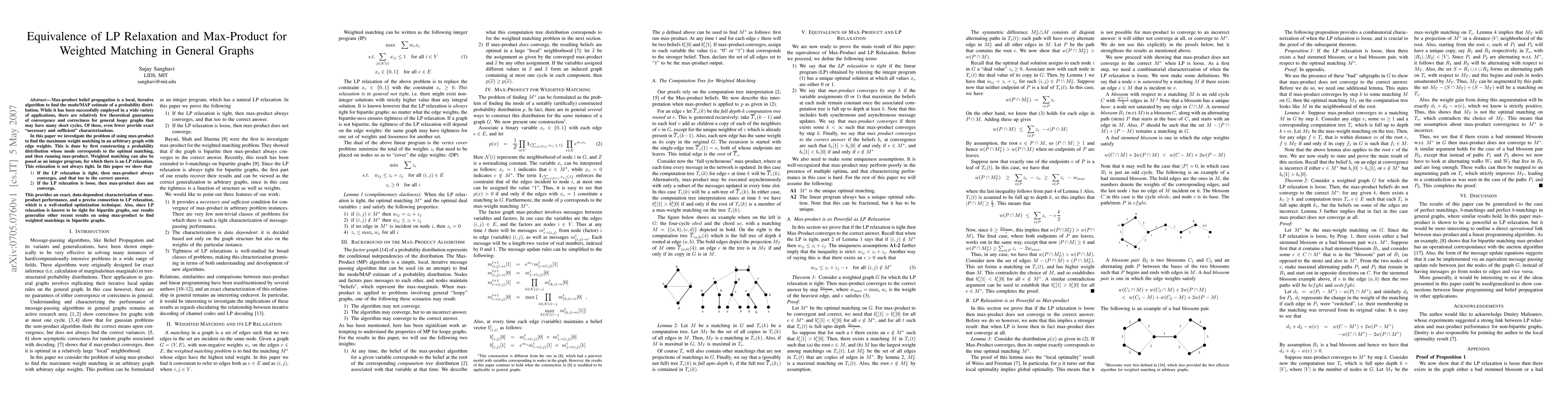Max-product belief propagation is a local, iterative algorithm to find the mode/MAP estimate of a probability distribution. While it has been successfully employed in a wide variety of applications, there are relatively few theoretical guarantees of convergence and correctness for general loopy graphs that may have many short cycles. Of these, even fewer provide exact ``necessary and sufficient'' characterizations. In this paper we investigate the problem of using max-product to find the maximum weight matching in an arbitrary graph with edge weights. This is done by first constructing a probability distribution whose mode corresponds to the optimal matching, and then running max-product. Weighted matching can also be posed as an integer program, for which there is an LP relaxation. This relaxation is not always tight. In this paper we show that \begin{enumerate} \item If the LP relaxation is tight, then max-product always converges, and that too to the correct answer. \item If the LP relaxation is loose, then max-product does not converge. \end{enumerate} This provides an exact, data-dependent characterization of max-product performance, and a precise connection to LP relaxation, which is a well-studied optimization technique. Also, since LP relaxation is known to be tight for bipartite graphs, our results generalize other recent results on using max-product to find weighted matchings in bipartite graphs.