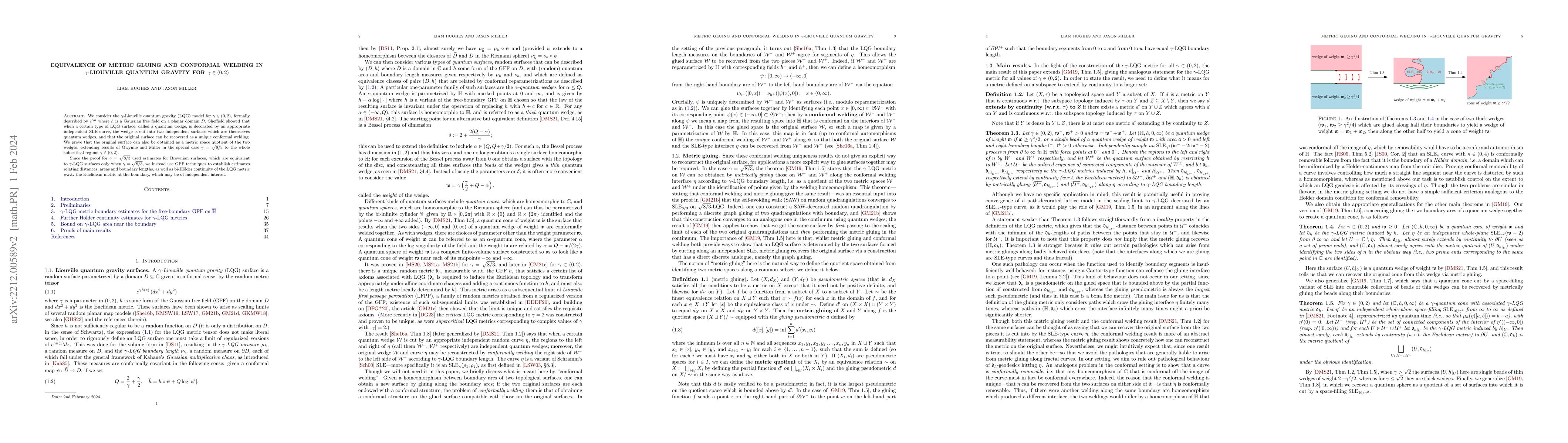 This paper proves the equivalence of metric gluing and conformal welding in $\gamma$-Liouville quantum gravity for $\gamma \in (0,2)$, extending previous results to the entire subcritical regime. It uses Gaussian free field techniques to establish estimates and continuity properties relevant to the LQG metric.