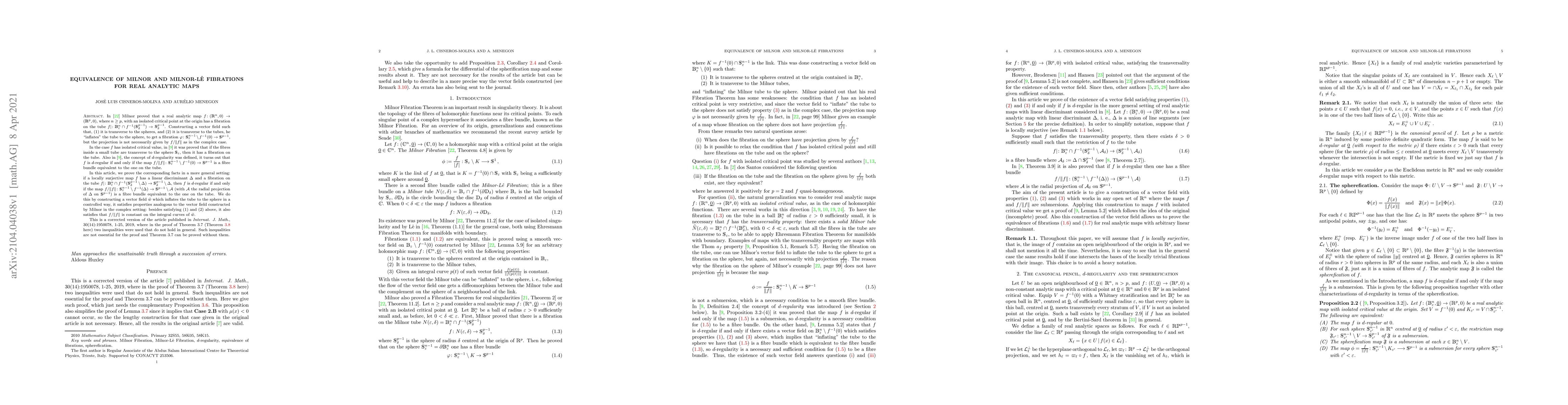 In [22] Milnor proved that a real analytic map $f\colon (R^n,0) \to (R^p,0)$, where $n \geq p$, with an isolated critical point at the origin has a fibration on the tube $f|\colon B_\epsilon^n \cap f^{-1}(S_\delta^{p-1}) \to S_\delta^{p-1}$. Constructing a vector field such that, (1) it is transverse to the spheres, and (2) it is transverse to the tubes, he "inflates" the tube to the sphere, to get a fibration $\varphi\colon S_\epsilon^{n-1} \setminus f^{-1}(0) \to S^{p-1}$, but the projection is not necessarily given by $f/ \|f\|$ as in the complex case. In the case $f$ has isolated critical value, in [9] it was proved that if the fibres inside a small tube are transverse to the sphere $S_\epsilon$, then it has a fibration on the tube. Also in [9], the concept of $d$-regularity was defined, it turns out that $f$ is $d$-regular if and only if the map $f/|f\|\colon S_\epsilon^{n-1} \setminus f^{-1}(0) \to S^{p-1}$ is a fibre bundle equivalent to the one on the tube. In this article, we prove the corresponding facts in a more general setting: if a locally surjective map $f$ has a linear discriminant $\Delta$ and a fibration on the tube $f|\colon B_\epsilon^n \cap f^{-1}(S_\delta^{p-1} \setminus \Delta) \to S_\delta^{p-1} \setminus \Delta$, then $f$ is $d$-regular if and only if the map $f/ \|f\|\colon S_\epsilon^{n-1} \setminus f^{-1}(\Delta) \to S^{p-1} \setminus \mathcal{A}$ (with $\mathcal{A}$ the radial projection of $\Delta$ on $S^{p-1}$) is a fibre bundle equivalent to the one on the tube. We do this by constructing a vector field $\tilde{w}$ which inflates the tube to the sphere in a controlled way, it satisfies properties analogous to the vector field constructed by Milnor in the complex setting: besides satisfying (1) and (2) above, it also satisfies that $f/ \|f\|$ is constant on the integral curves of $\tilde{w}$.