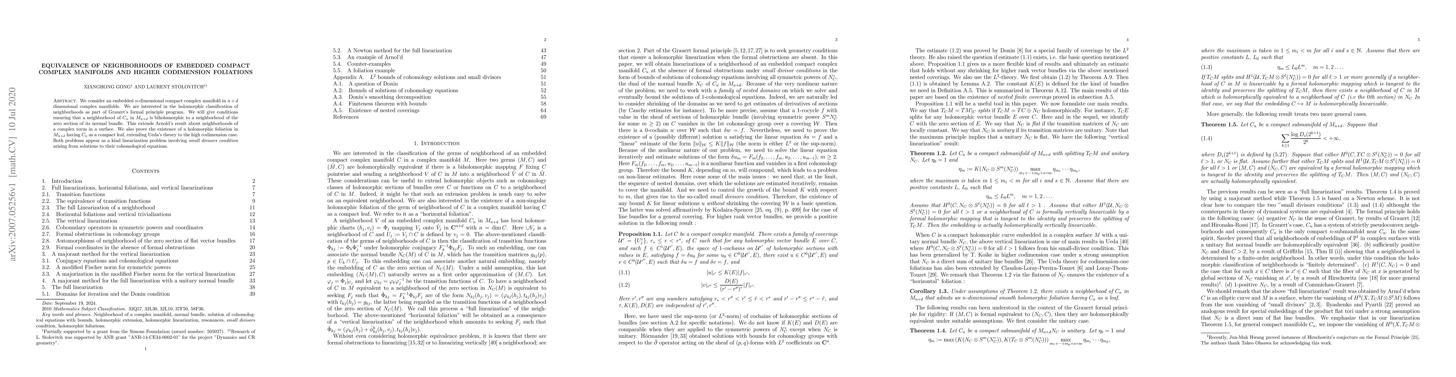 This paper presents conditions for biholomorphic equivalence of neighborhoods of embedded compact complex manifolds in higher-dimensional complex manifolds, extending previous results on complex tori and foliations. It solves linearization problems with small divisors conditions via cohomological equations.