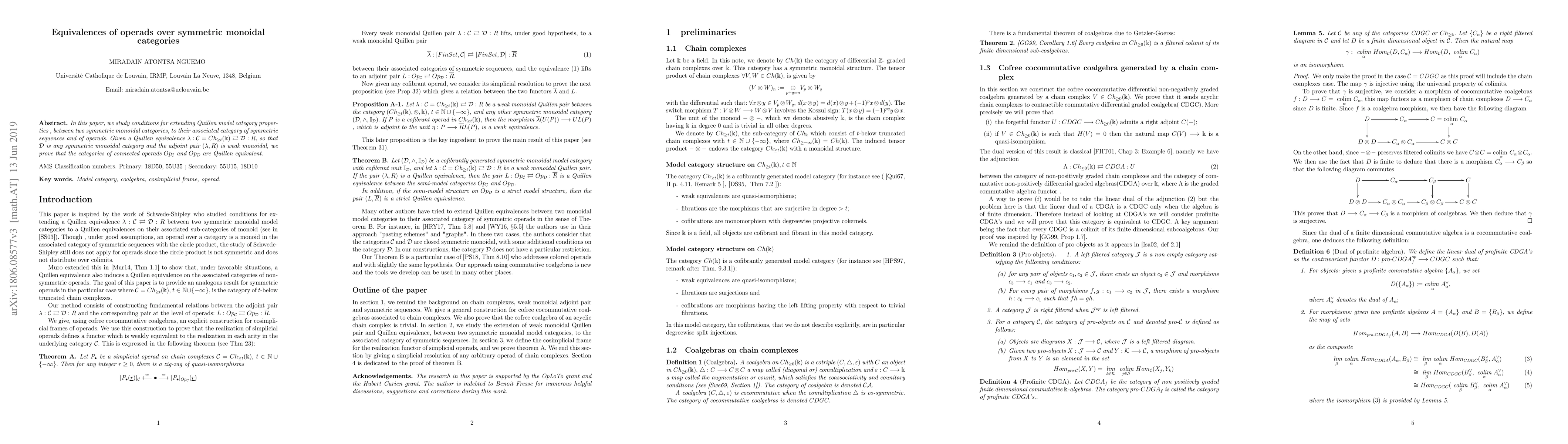 In this paper, we study conditions for extending Quillen model category properties , between two symmetric monoidal categories, to their associated category of symmetric sequences and of operads. Given a Quillen equivalence $\lambda: \mathcal{C}=Ch_{\Bbbk,t} \leftrightarrows \mathcal{D}: R,$ so that $\mathcal{D}$ is any symmetric monoidal category and the adjoint pair $(\lambda, R)$ is weak monoidal, we prove that the categories of connected operads $Op_\mathcal{C}$ and $Op_\mathcal{D}$ are Quillen equivalent. This expands an analogous result of Schwede-Shipley(\cite{SS03}) when we replace these categories of operads with the sub-categories of $\mathcal{C}$-Monoid and $\mathcal{D}$-monoid.