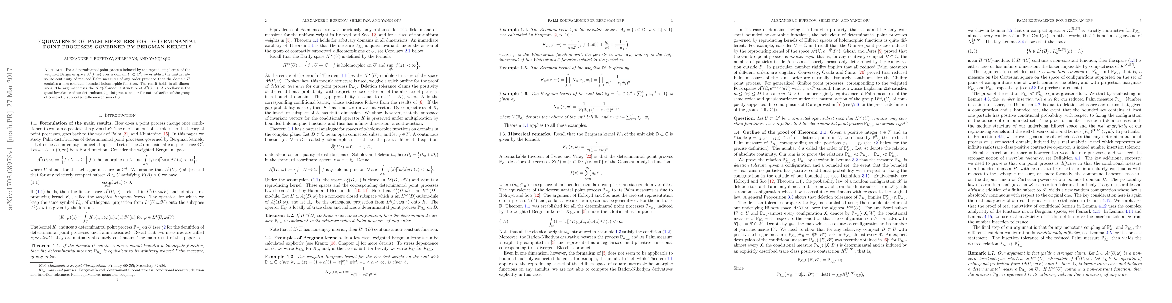 This paper establishes the mutual absolute continuity of reduced Palm measures for determinantal point processes governed by Bergman kernels in any dimension, provided the domain contains a non-constant bounded holomorphic function. The result leverages the $H^\infty(U)$-module structure of the weighted Bergman space and implies the quasi-invariance of the process under compactly supported diffeomorphisms.