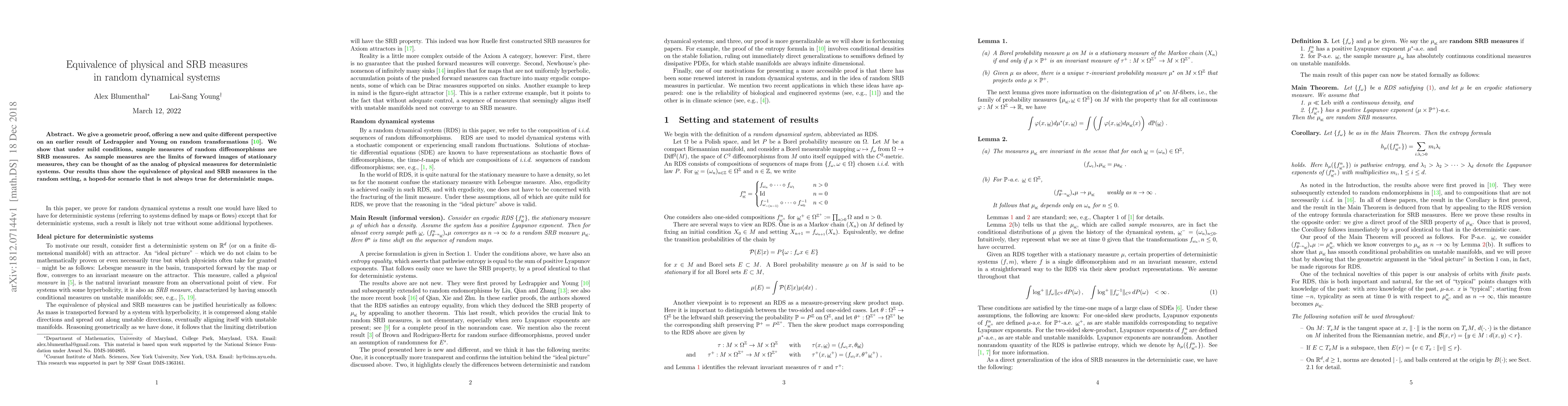 This paper provides a geometric proof demonstrating the equivalence of physical and SRB measures in random dynamical systems under mild conditions, contrasting with deterministic systems where such equivalence is not always guaranteed. The study builds on Ledrappier and Young's earlier work on random transformations.