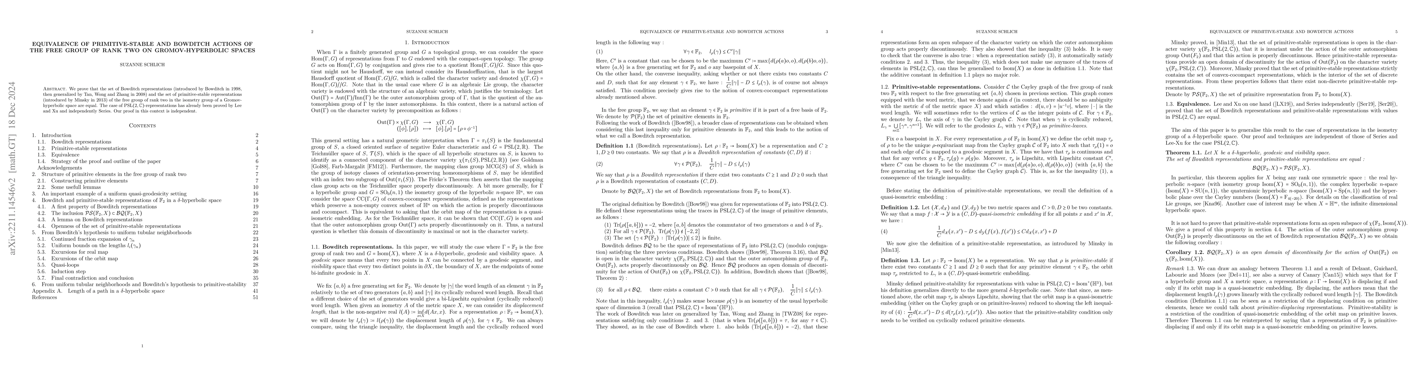 We prove that the set of Bowditch representations (introduced by Bowditch in 1998, then generalized by Tan, Wong and Zhang in 2008) and the set of primitive-stable representations (introduced by Minsky in 2013) of the free group of rank two in the isometry group of a Gromov-hyperbolic space are equal. The case of $\mathrm{PSL}(2,\mathbb{C})$-representations has already been proved by Series and independently by Lee and Xu. Our poof in this context is independent.