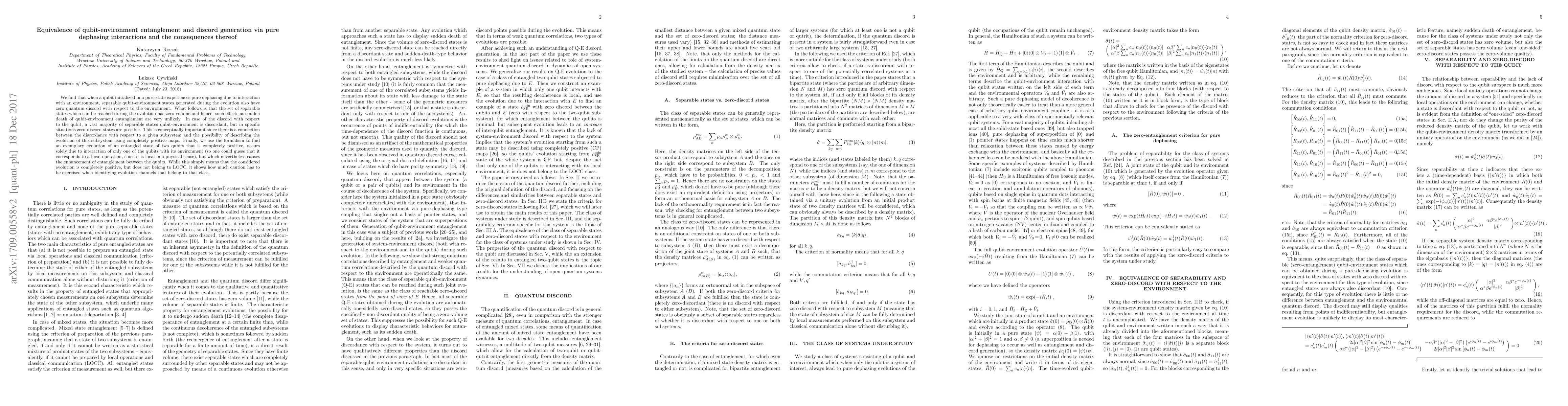 We find that when a qubit initialized in a pure state experiences pure dephasing due to interaction with an environment, separable qubit-environment states generated during the evolution also have zero quantum discord with respect to the environment. What follows is that the set of separable states which can be reached during the evolution has zero volume and hence, such effects as sudden death of qubit-environment entanglement are very unlikely. In case of the discord with respect to the qubit, a vast majority of separable states qubit-environment is discordant, but in specific situations zero-discord states are possible. This is conceptually important since there is a connection between the discordance with respect to a given subsystem and the possibility of describing the evolution of this subsystem using completely positive maps. Finally, we use the formalism to find an exemplary evolution of an entangled state of two qubits that is completely positive, occurs solely due to interaction of only one of the qubits with its environment (so one could guess that it corresponds to a local operation, since it is local in a physical sense), but which nevertheless causes the enhancement of entanglement between the qubits. While this simply means that the considered evolution is completely positive, but does not belong to LOCC, it shows how much caution has to be exercised when identifying evolution channels that belong to that class.