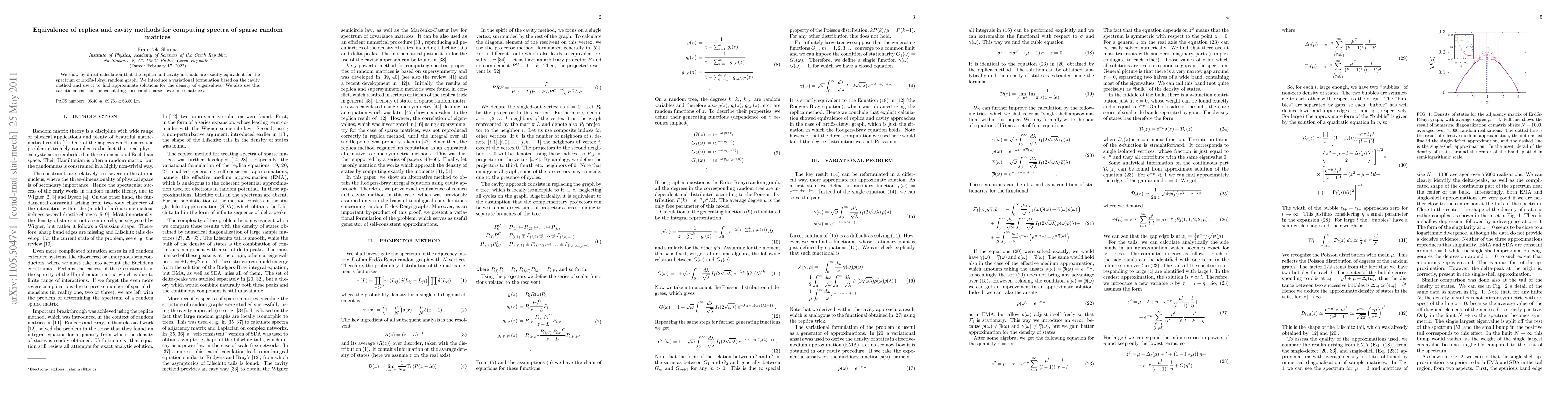 Summary: The paper demonstrates the exact equivalence of replica and cavity methods for computing the spectrum of Erdos-Renyi random graphs and introduces a variational formulation based on the cavity method to approximate the density of eigenvalues and calculate spectra for sparse covariance matrices.