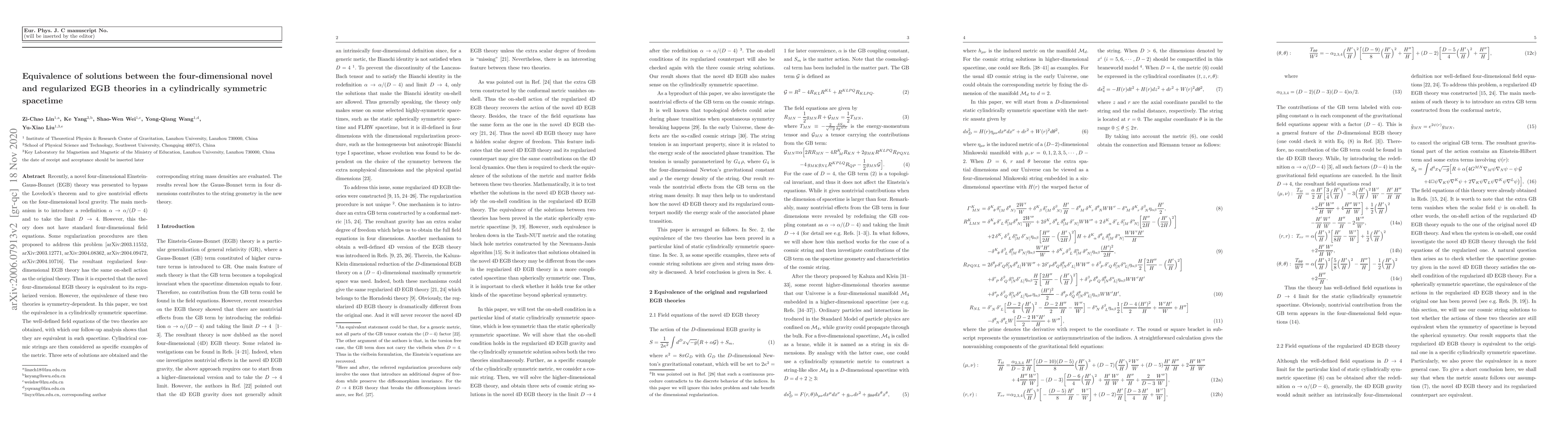 This paper investigates the equivalence between a novel four-dimensional Einstein-Gauss-Bonnet (EGB) theory and its regularized version in cylindrically symmetric spacetime. The study finds that the two theories yield equivalent solutions, demonstrating the impact of the Gauss-Bonnet term in four dimensions on cylindrical cosmic string geometries.
