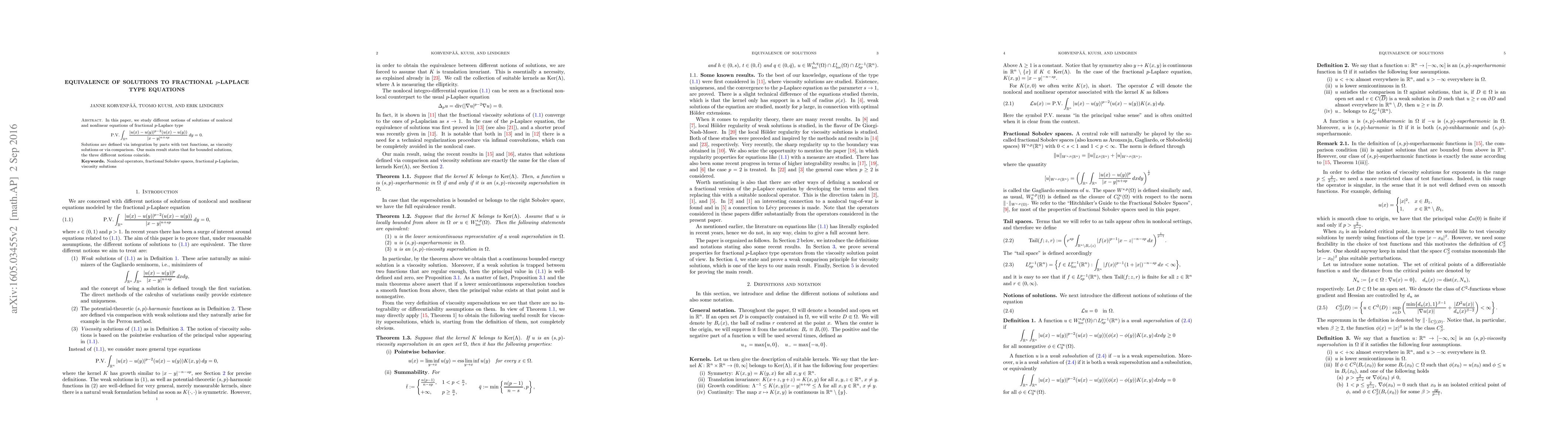 In this paper, we study different notions of solutions of nonlocal and nonlinear equations of fractional $p$-Laplace type $${\rm P.V.} \int_{\mathbb R^n}\frac{|u(x)-u(y)|^{p-2}(u(x)-u(y))}{|x-y|^{n+sp}}\,dy = 0.$$ Solutions are defined via integration by parts with test functions, as viscosity solutions or via comparison. Our main result states that for bounded solutions, the three different notions coincide.