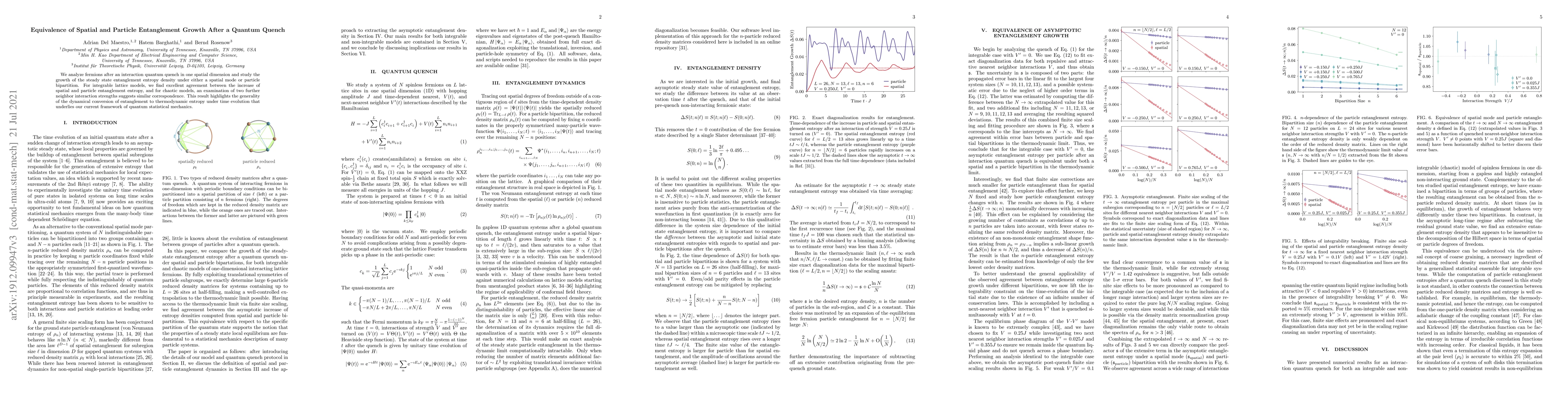 We analyze fermions after an interaction quantum quench in one spatial dimension and study the growth of the steady state entanglement entropy density under either a spatial mode or particle bipartition. For integrable lattice models, we find excellent agreement between the increase of spatial and particle entanglement entropy, and for chaotic models, an examination of two further neighbor interaction strengths suggests similar correspondence. This result highlights the generality of the dynamical conversion of entanglement to thermodynamic entropy under time evolution that underlies our current framework of quantum statistical mechanics.