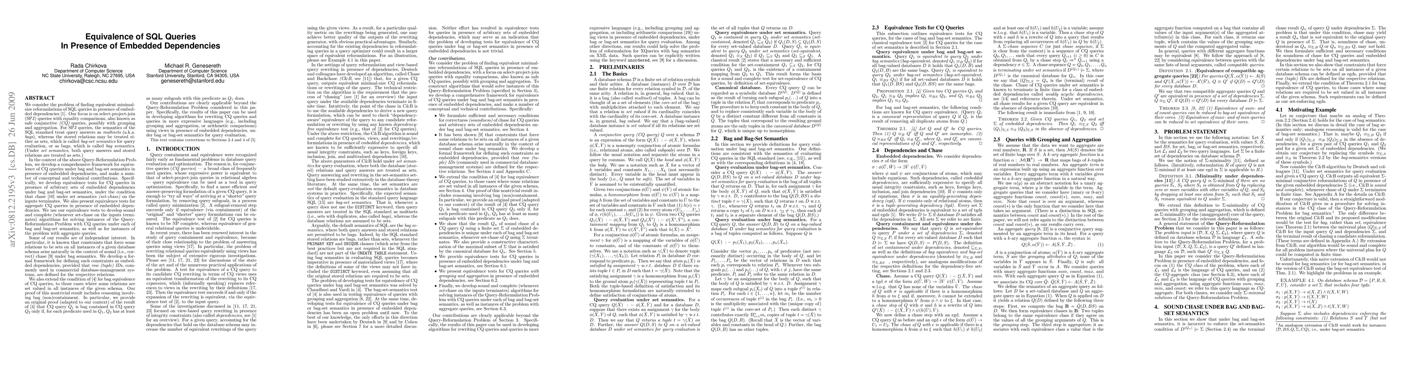 This paper develops a framework for determining equivalent minimal-size reformulations of SQL select-project-join queries, especially under bag and bag-set semantics, in the presence of embedded dependencies. It presents algorithms for solving the Query-Reformulation Problem under these conditions, ensuring soundness and completeness when set-chase terminates.