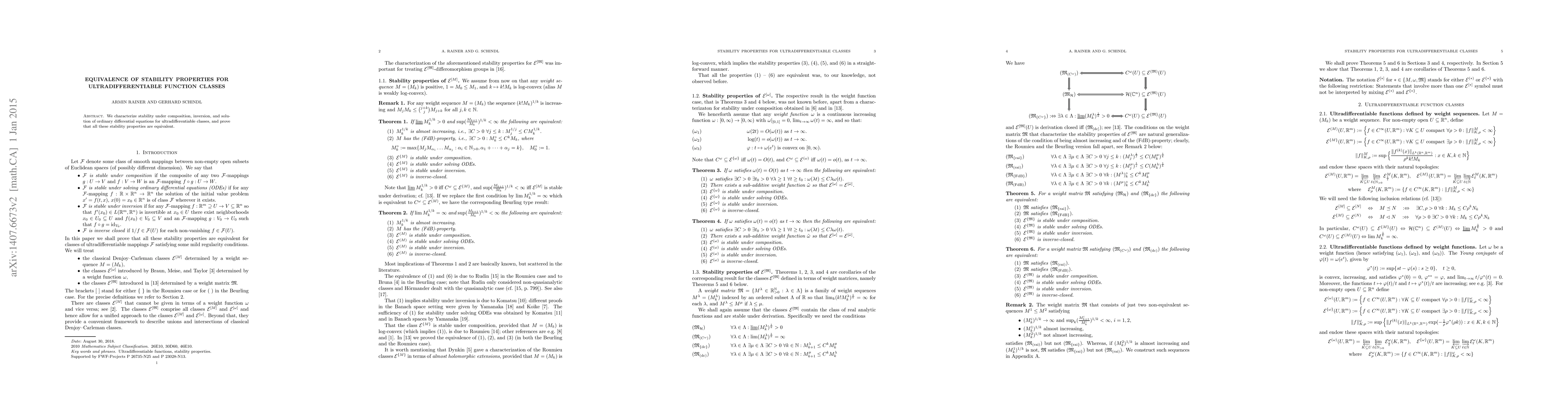 Summary: This paper characterizes the stability properties under composition, inversion, and ordinary differential equations for ultradifferentiable function classes, proving their equivalence. The findings establish a comprehensive understanding of the robustness of these function classes under various mathematical operations.