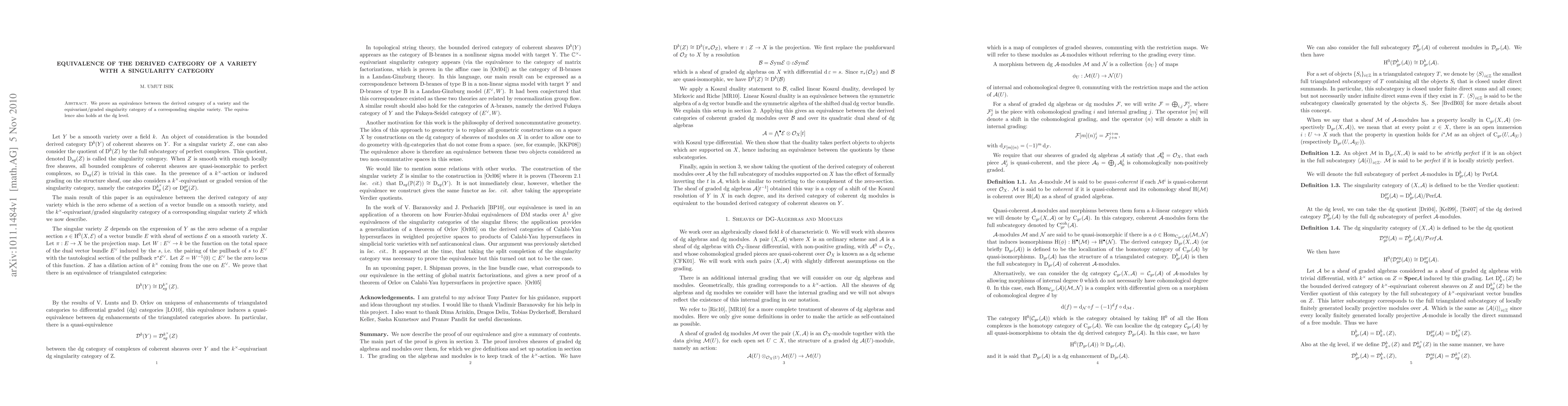 Summary: This paper establishes an equivalence between the derived category of a variety and the equivariant/graded singularity category of its singular counterpart, demonstrating the relationship holds at the differential graded level as well.