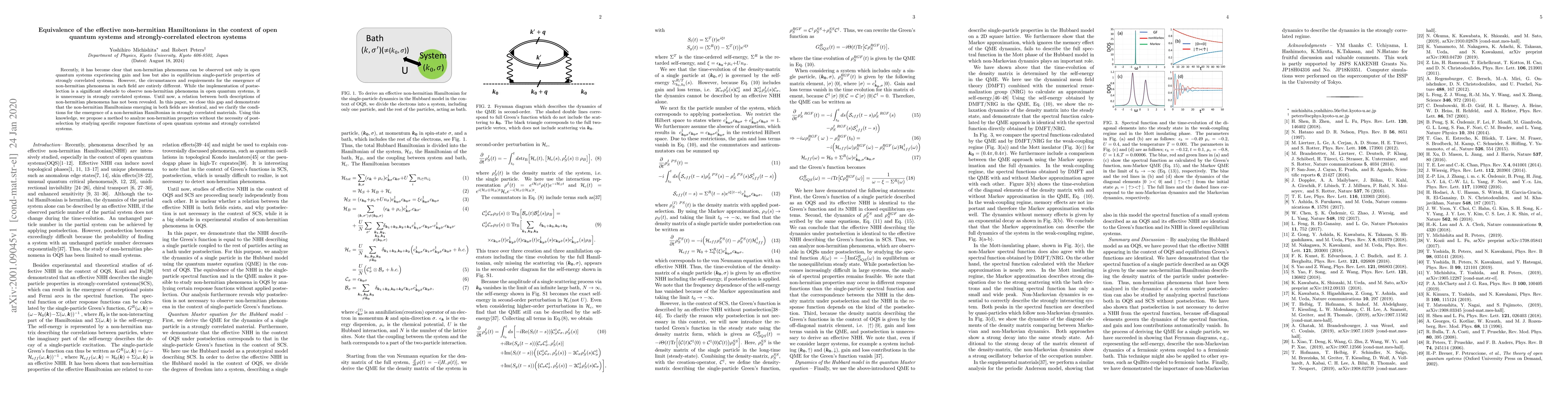 This paper establishes the equivalence of non-hermitian Hamiltonians in open quantum systems and strongly-correlated electron systems, revealing that despite different contexts, the underlying Hamiltonians are identical. It proposes a method to analyze non-hermitian properties without postselection by examining specific response functions.