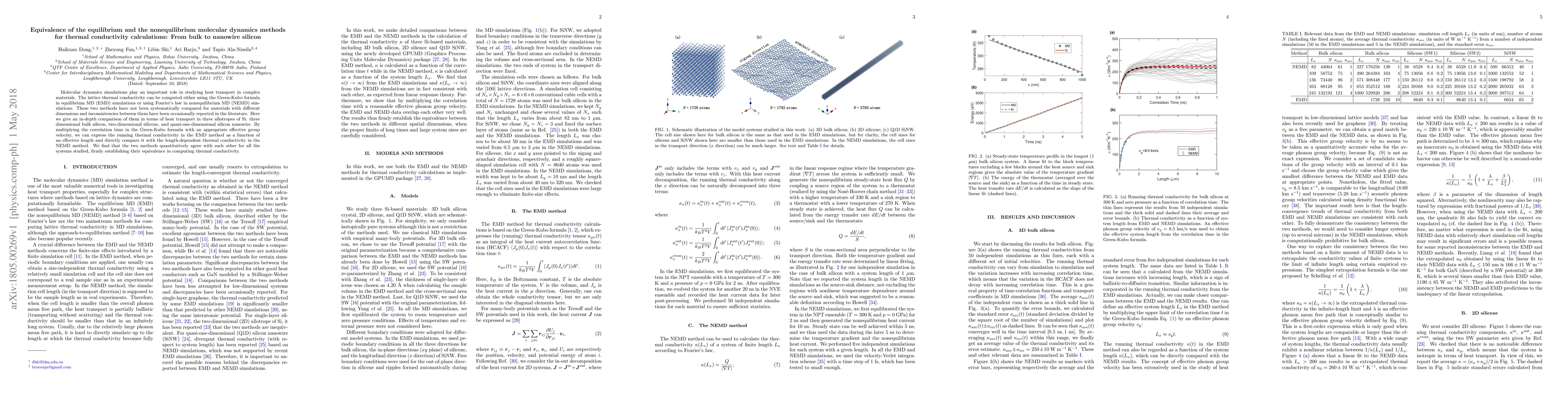 This paper compares equilibrium and nonequilibrium molecular dynamics methods for calculating thermal conductivity in bulk silicon, silicene, and silicon nanowires, finding quantitative agreement between the two methods, thus establishing their equivalence.