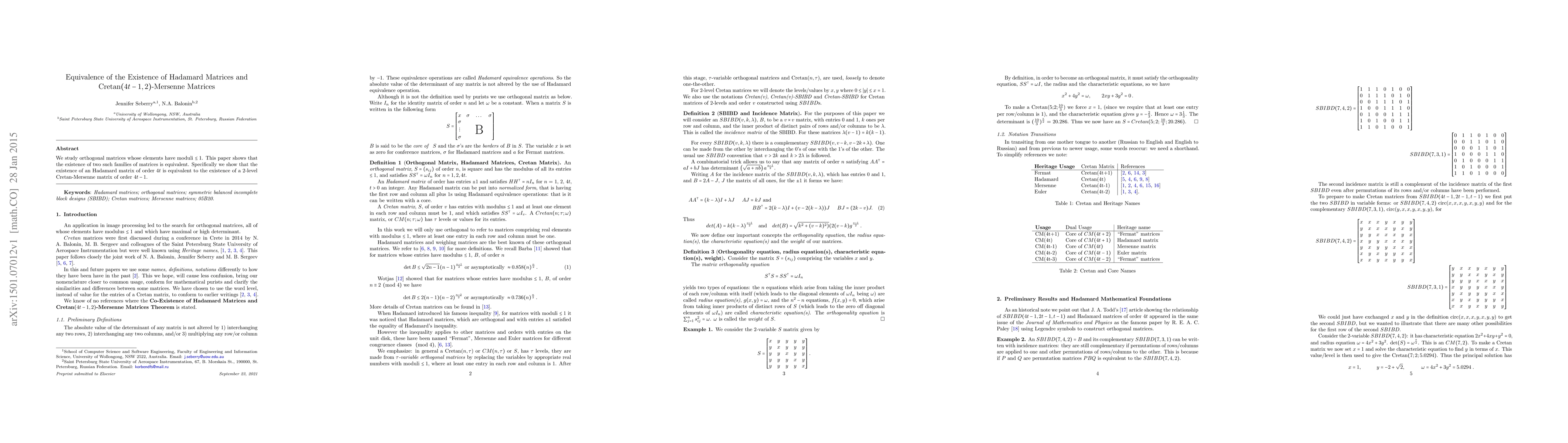 We study orthogonal matrices whose elements have moduli $\leq 1$. This paper shows that the existence of two such families of matrices is equivalent. Specifically we show that the existence of an Hadamard matrix of order $4t$ is equivalent to the existence of a Cretan$(4t-1,2)$-Mersenne matrix.