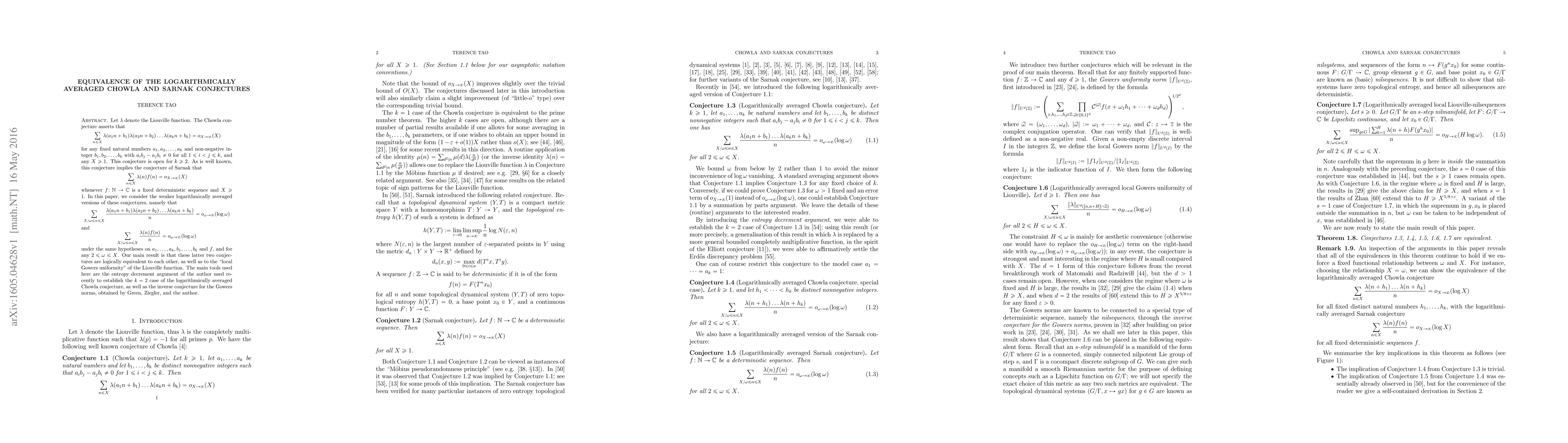 This paper demonstrates that the logarithmically averaged versions of the Chowla and Sarnak conjectures are logically equivalent, using the entropy decrement method and the inverse conjecture for Gowers norms. The equivalence also extends to the "local Gowers uniformity" of the Liouville function.