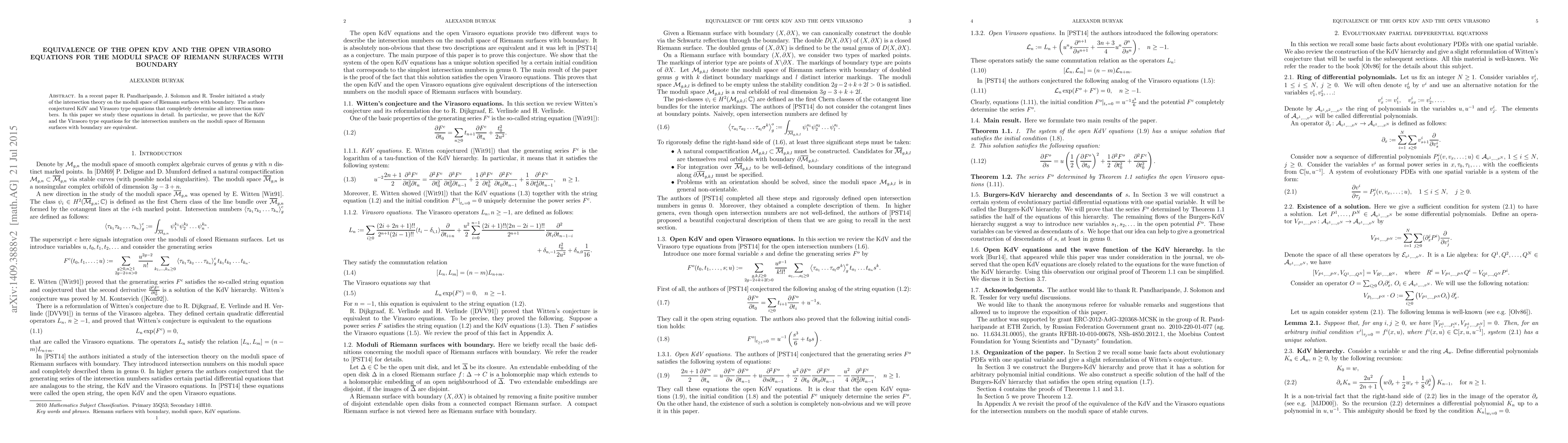 In a recent paper R. Pandharipande, J. Solomon and R. Tessler initiated a study of the intersection theory on the moduli space of Riemann surfaces with boundary. The authors conjectured KdV and Virasoro type equations that completely determine all intersection numbers. In this paper we study these equations in detail. In particular, we prove that the KdV and the Virasoro type equations for the intersection numbers on the moduli space of Riemann surfaces with boundary are equivalent.