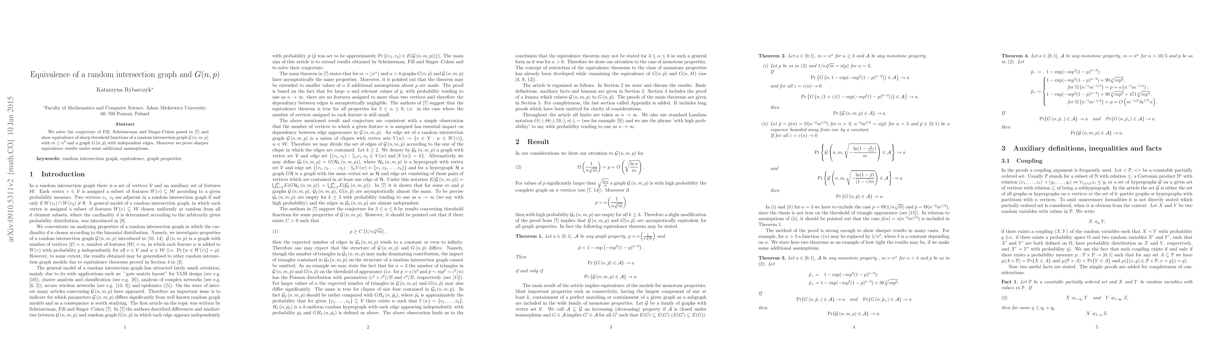 Researchers proved that the random intersection graph G(n,m,p) is equivalent to a graph where each edge appears independently when m >= n^3, resolving a conjecture on sharp threshold functions.