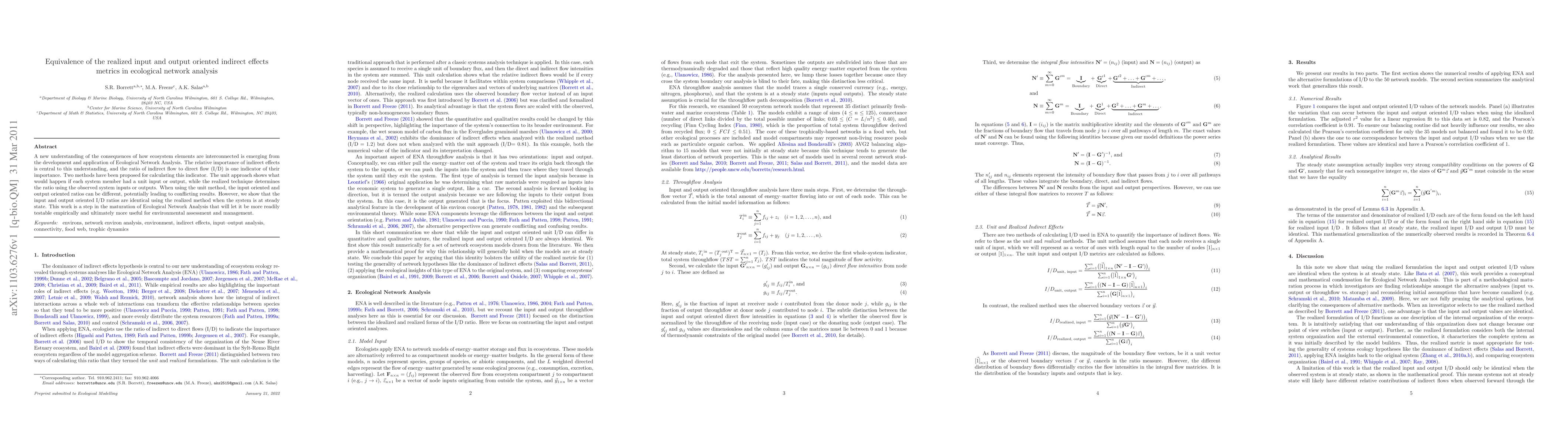 This paper demonstrates that the realized input and output oriented indirect effects metrics are equivalent in Ecological Network Analysis when the system is at steady state, enhancing the reliability of environmental assessments and management strategies. This finding resolves discrepancies found in the unit approach, advancing the field's empirical testability.