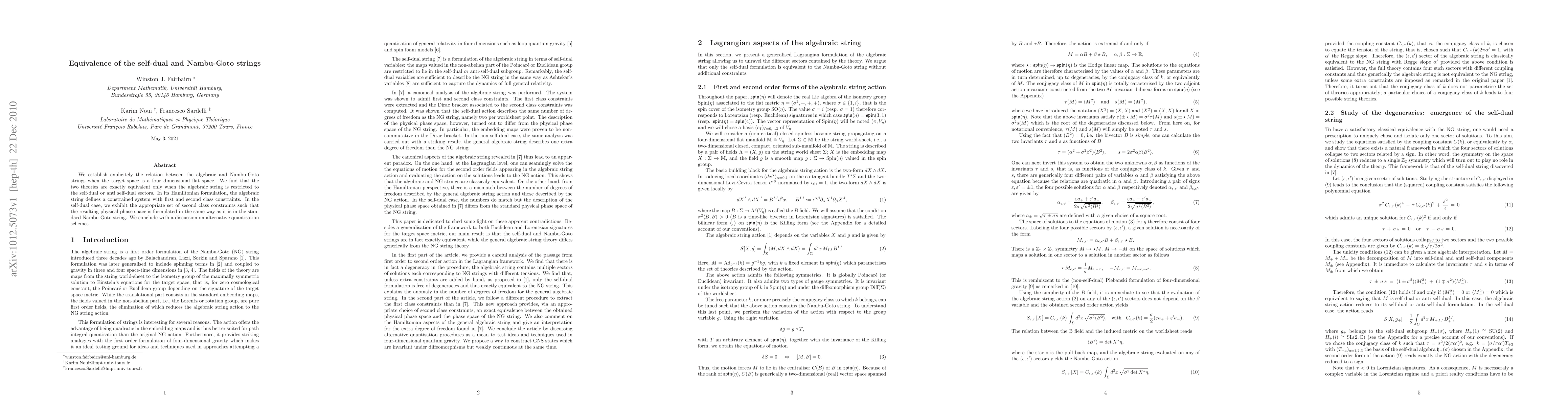 This paper establishes the equivalence between algebraic and Nambu-Goto strings in four-dimensional flat space, showing that the two theories match only when the algebraic string is limited to self-dual or anti-self-dual sectors. It details the constraints in the Hamiltonian formulation that align the physical phase space of the algebraic string with that of the Nambu-Goto string.