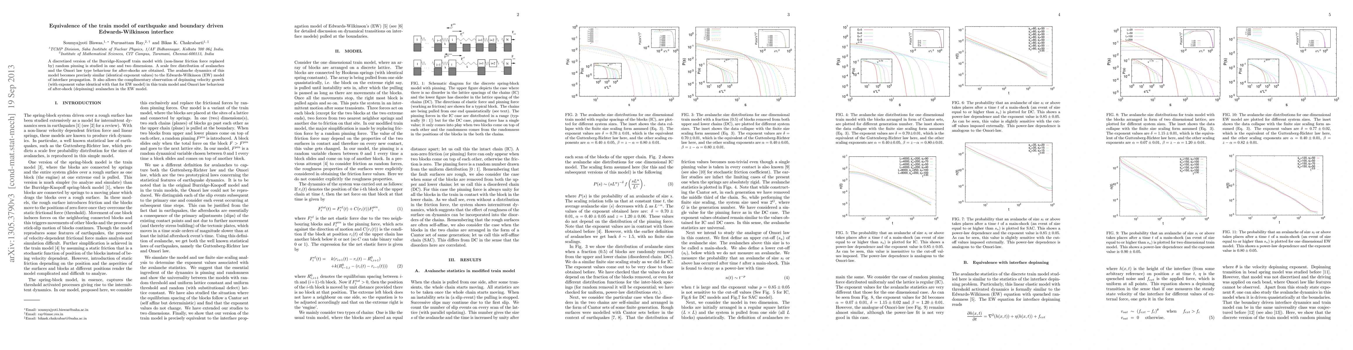 This paper studies a discretized version of the Burridge-Knopoff train model with random pinning, showing equivalence in avalanche dynamics to the Edwards-Wilkinson model of interface propagation, with identical exponent values for both models. Both models exhibit scale-free avalanche distributions and Omori law behavior for after-shocks.