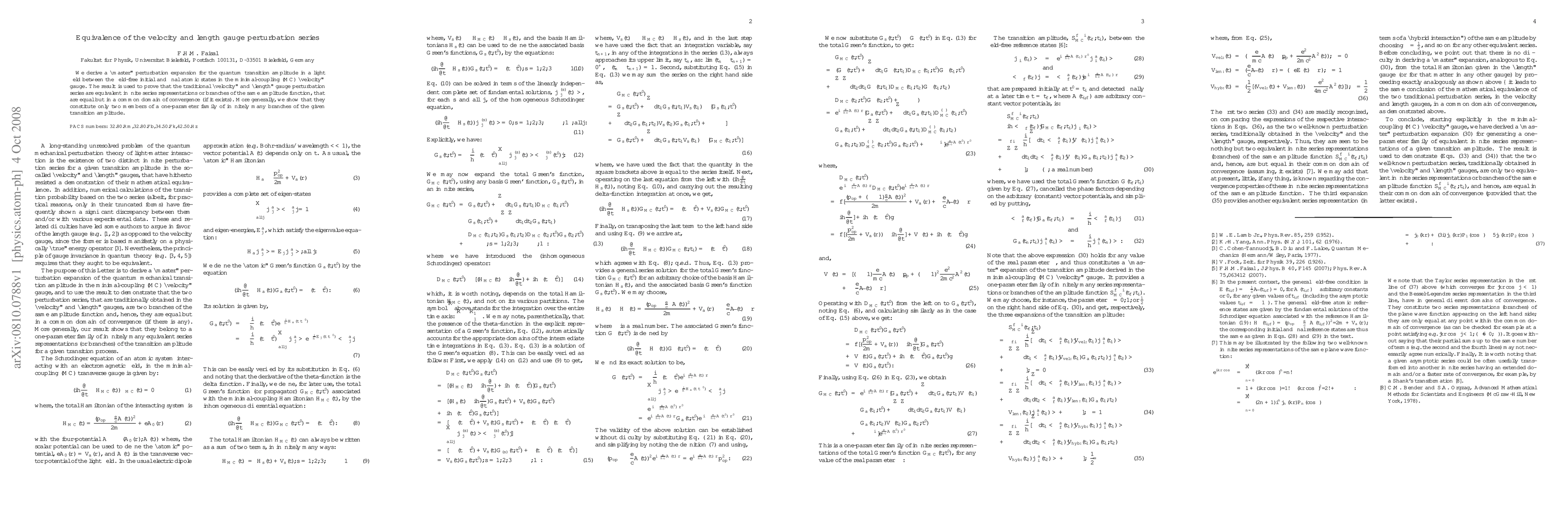 We derive a "master" perturbation expansion for the quantum transition amplitude in a light field between the field-free initial and final atomic states in the minimal-coupling (MC) "velocity" gauge. The result is used to prove that the traditional "velocity" and "length" gauge perturbation series are equivalent infinite series representations or branches of the same amplitude function, that are equal but in a common domain of convergence (if it exists). More generally, we show that they constitute only two members of a one-parameter family of infinitely many branches of the given transition amplitude.