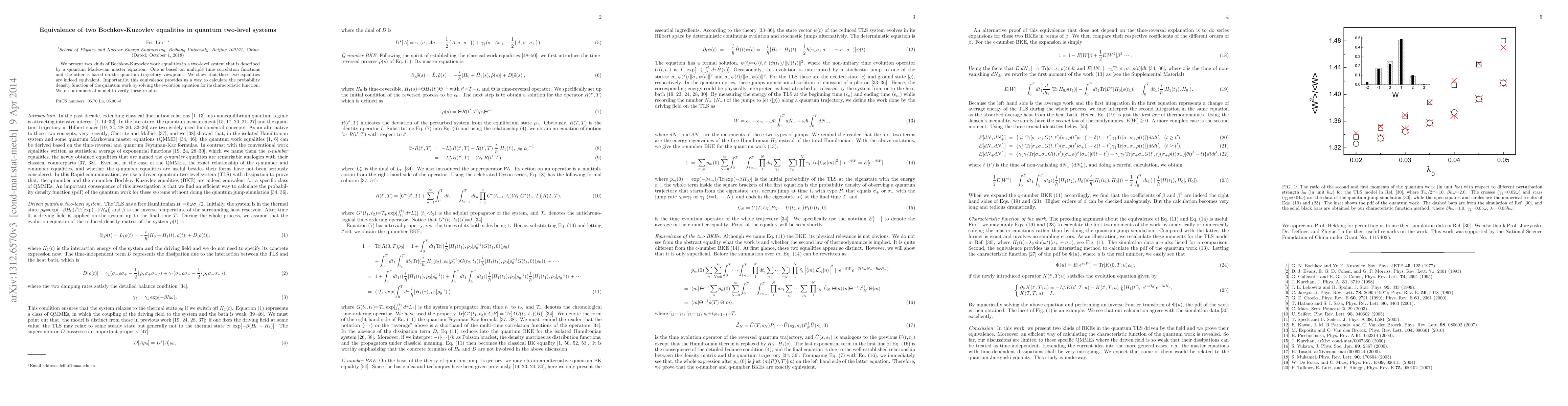 This paper demonstrates the equivalence of two Bochkov-Kuzovlev equalities in quantum two-level systems, showing that both methods—one based on multiple time correlation functions and the other on the quantum trajectory viewpoint—yield the same results. The study provides a method for calculating the probability density function of quantum work and verifies the findings using a numerical model.