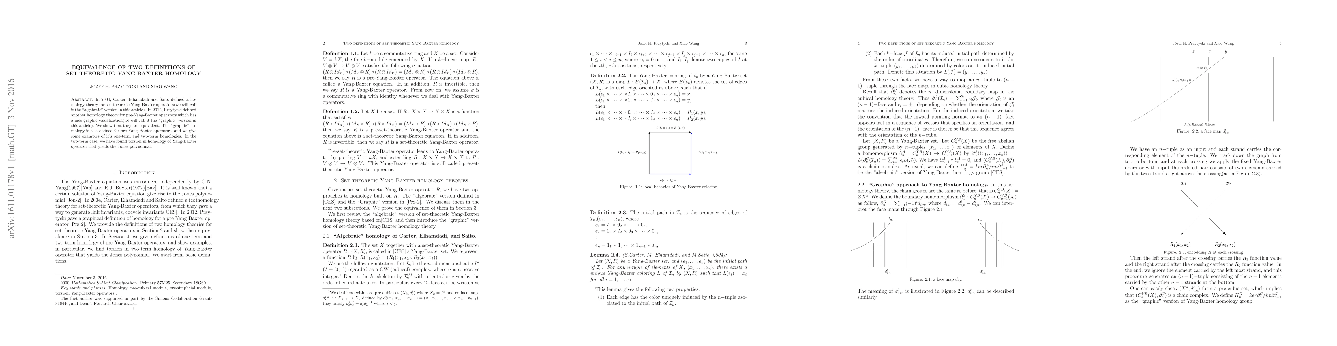 In 2004, Carter, Elhamdadi and Saito defined a homology theory for set-theoretic Yang-Baxter operators(we will call it the "algebraic" version in this article). In 2012, Przytycki defined another homology theory for pre-Yang-Baxter operators which has a nice graphic visualization(we will call it the "graphic" version in this article). We show that they are equivalent. The "graphic" homology is also defined for pre-Yang-Baxter operators, and we give some examples of it's one-term and two-term homologies. In the two-term case, we have found torsion in homology of Yang-Baxter operator that yields the Jones polynomial.
