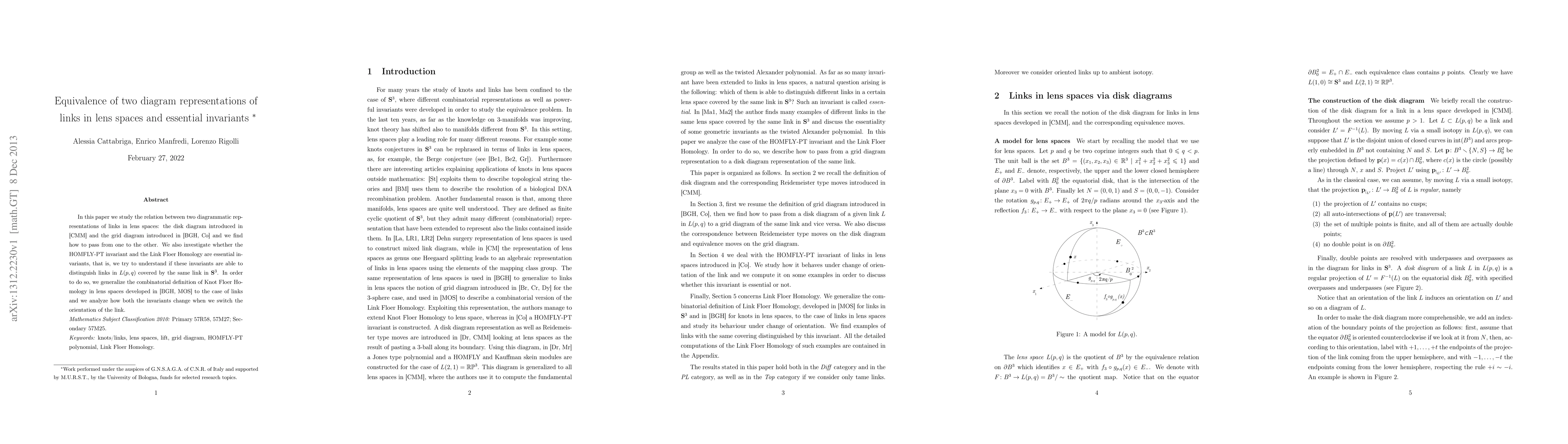 In this paper we study the relation between two diagrammatic representations of links in lens spaces: the disk diagram and the grid diagram and we find how to pass from one to the other. We also investigate whether the HOMFLY-PT invariant and the Link Floer Homology are essential invariants, that is, we try to understand if these invariants are able to distinguish links in $L(p,q)$ covered by the same link in $\mathbf{S}^3$. In order to do so, we generalize the combinatorial definition of Knot Floer Homology in lens spaces to the case of links and we analyze how both the invariants change when we switch the orientation of the link.