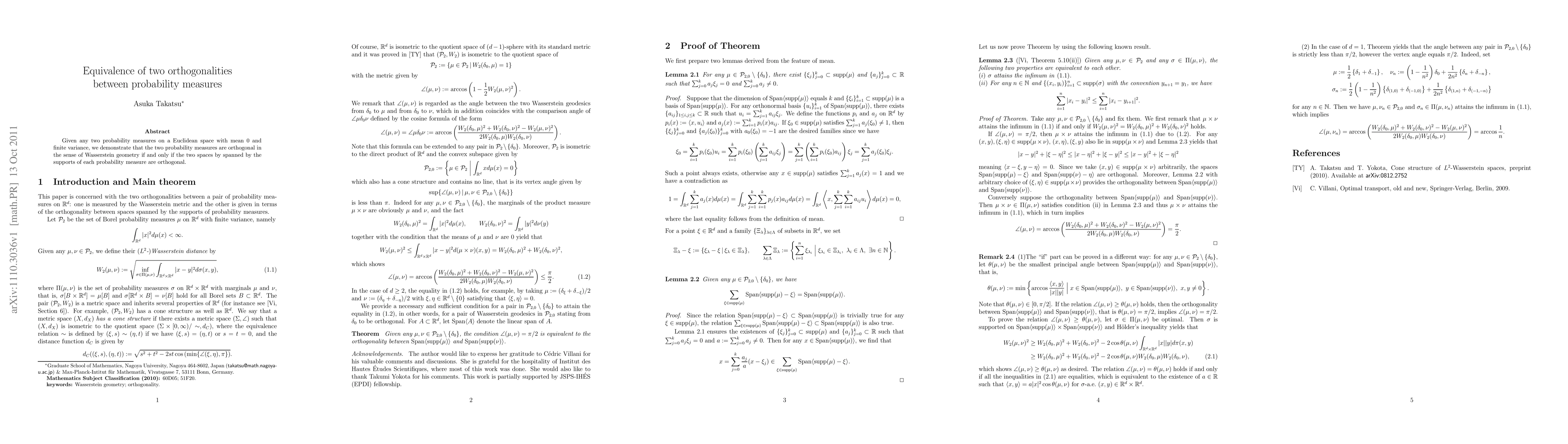 Two probability measures on a Euclidean space are orthogonal in Wasserstein geometry if their support spaces are orthogonal, according to this research paper.