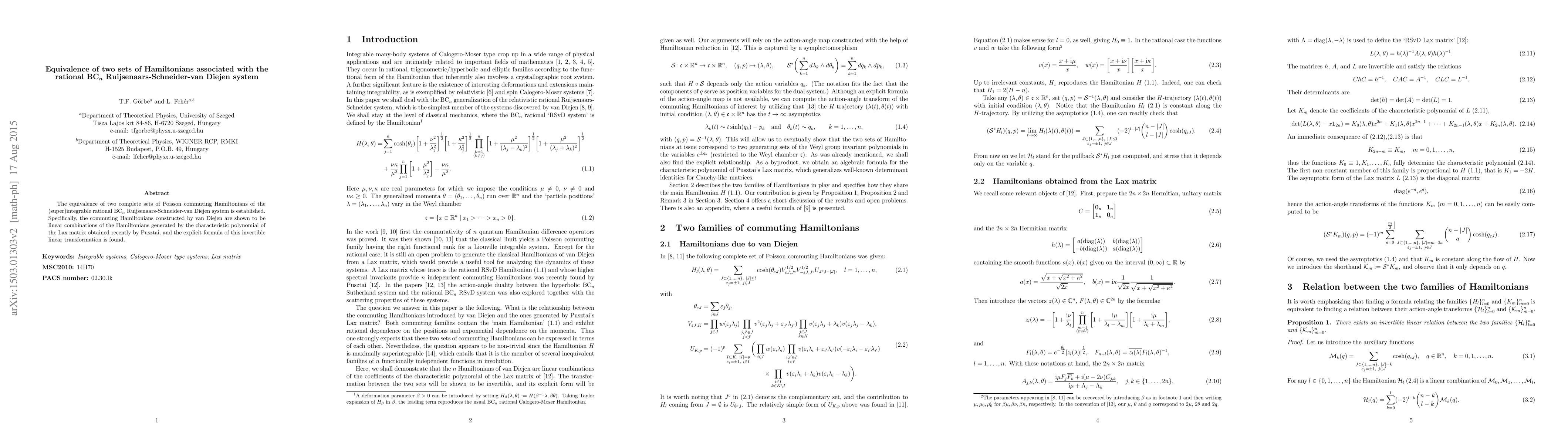 The equivalence of two complete sets of Poisson commuting Hamiltonians of the (super)integrable rational BC(n) Ruijsenaars-Schneider-van Diejen system is established. Specifically, the commuting Hamiltonians constructed by van Diejen are shown to be linear combinations of the Hamiltonians generated by the characteristic polynomial of the Lax matrix obtained recently by Pusztai, and the explicit formula of this invertible linear transformation is found.