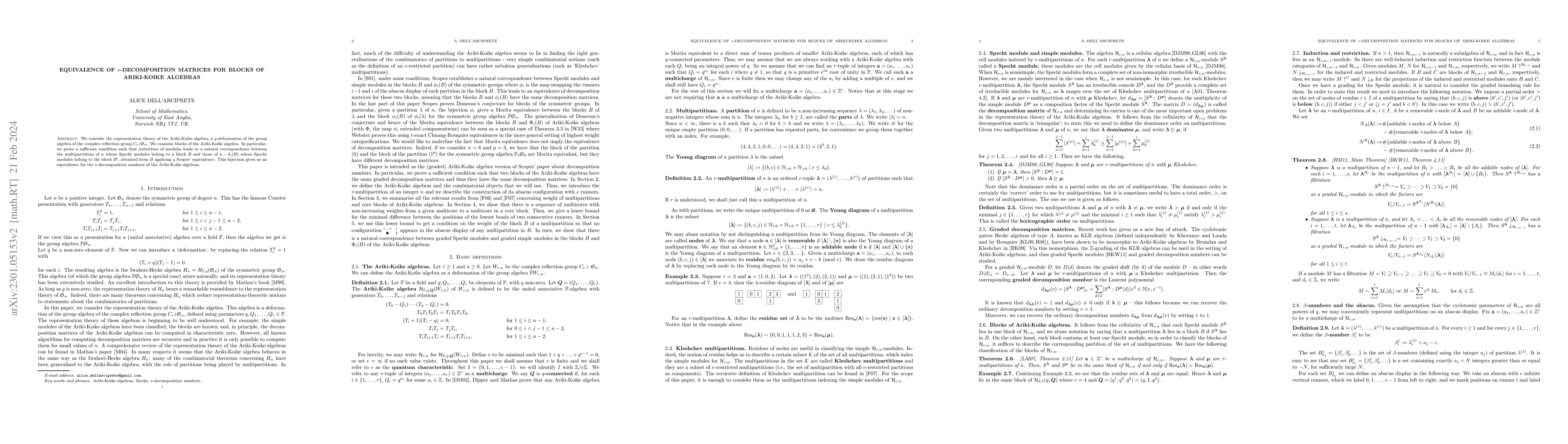 This paper explores the representation theory of Ariki-Koike algebras, proving a condition for a natural correspondence between Specht modules of blocks under Scopes' equivalence, leading to an equivalence of $v$-decomposition matrices for these blocks.