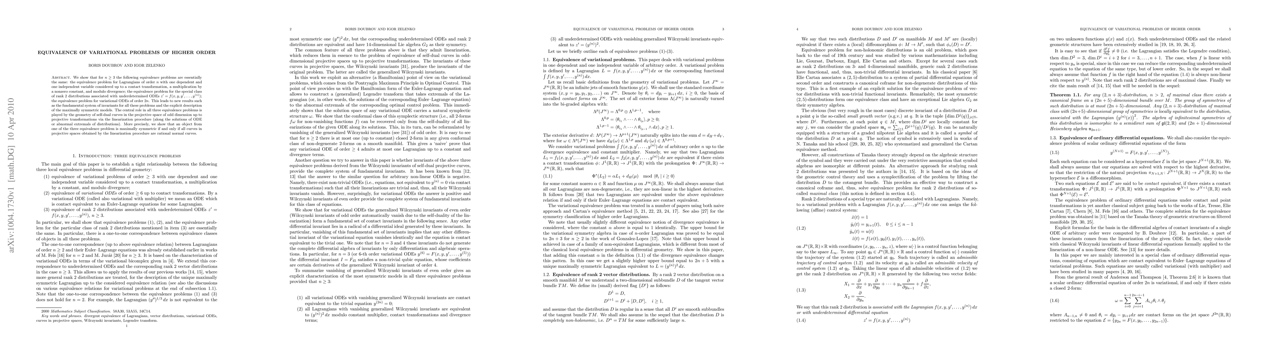 We show that for n>2 the following equivalence problems are essentially the same: the equivalence problem for Lagrangians of order n with one dependent and one independent variable considered up to a contact transformation, a multiplication by a nonzero constant, and modulo divergence; the equivalence problem for the special class of rank 2 distributions associated with underdetermined ODEs z'=f(x,y,y',..., y^{(n)}); the equivalence problem for variational ODEs of order 2n. This leads to new results such as the fundamental system of invariants for all these problems and the explicit description of the maximally symmetric models. The central role in all three equivalence problems is played by the geometry of self-dual curves in the projective space of odd dimension up to projective transformations via the linearization procedure (along the solutions of ODE or abnormal extremals of distributions). More precisely, we show that an object from one of the three equivalence problem is maximally symmetric if and only if all curves in projective spaces obtained by the linearization procedure are rational normal curves.