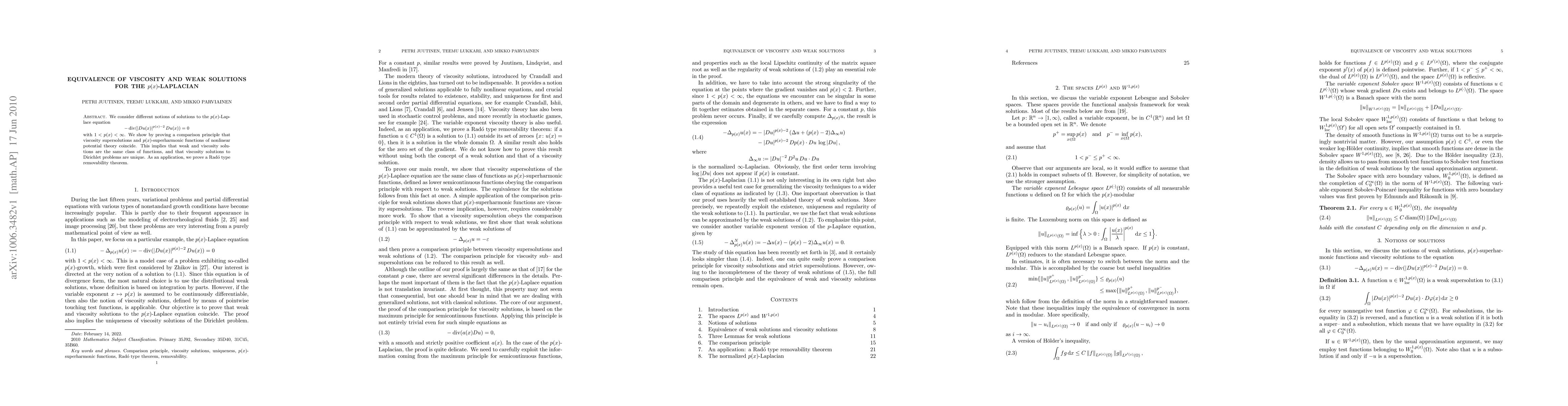 We consider different notions of solutions to the $p(x)$-Laplace equation $-\div(\abs{Du(x)}^{p(x)-2}Du(x))=0$ with $ 1